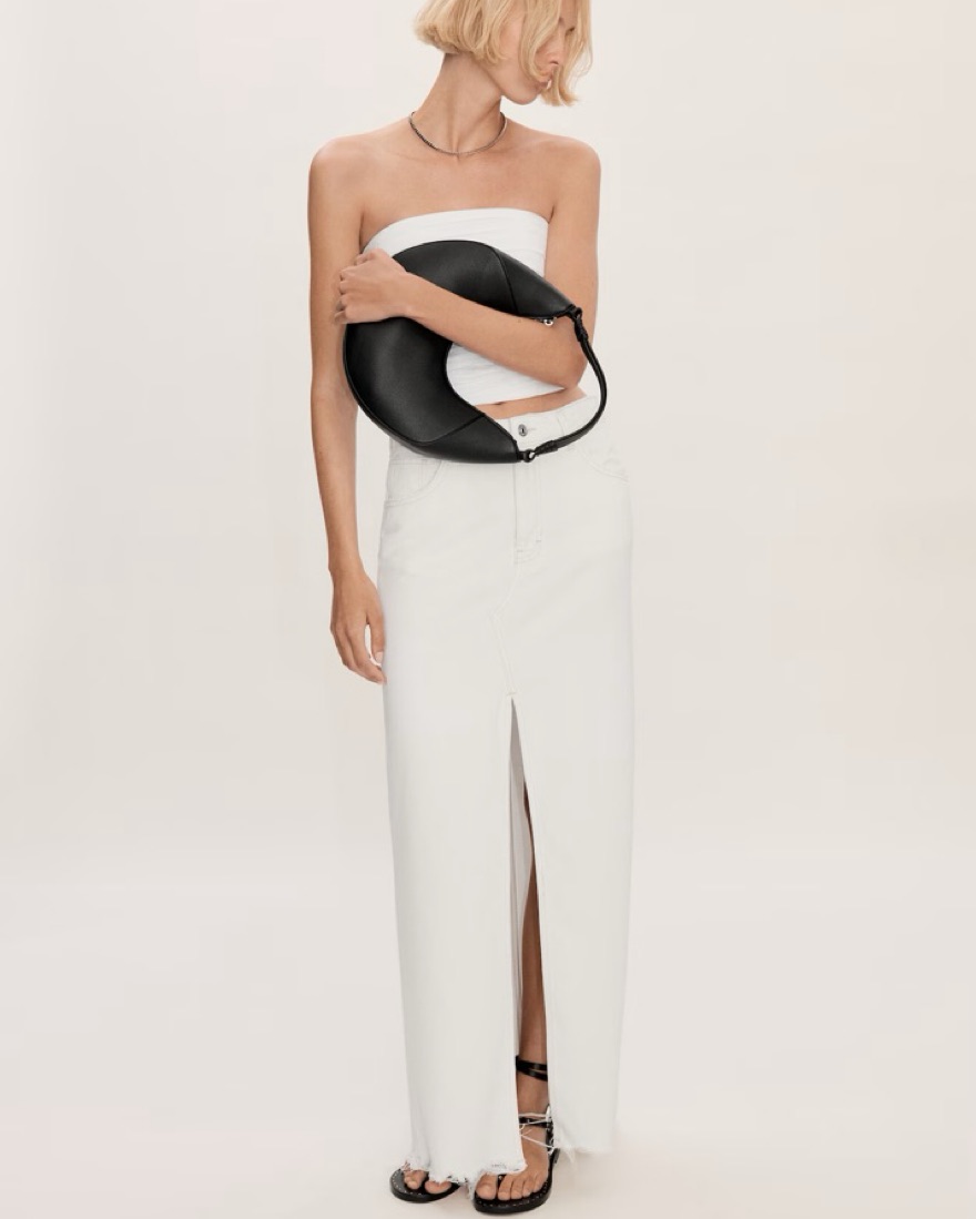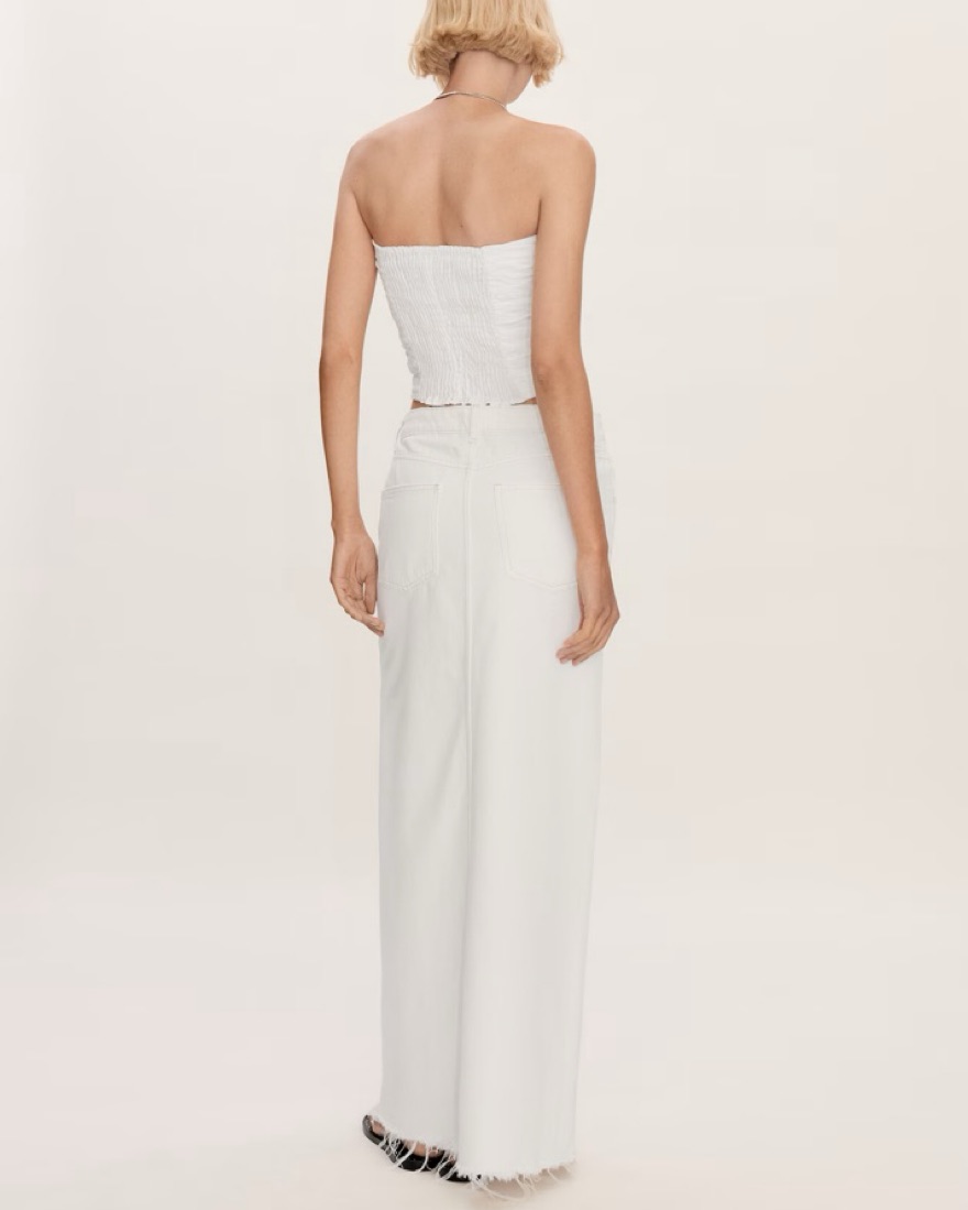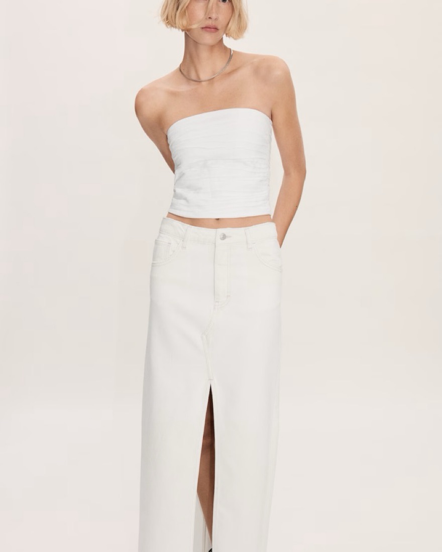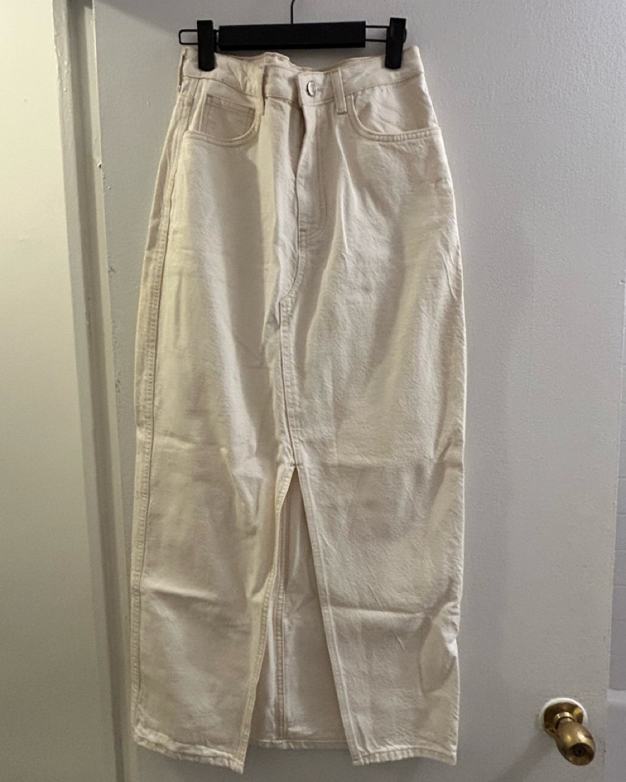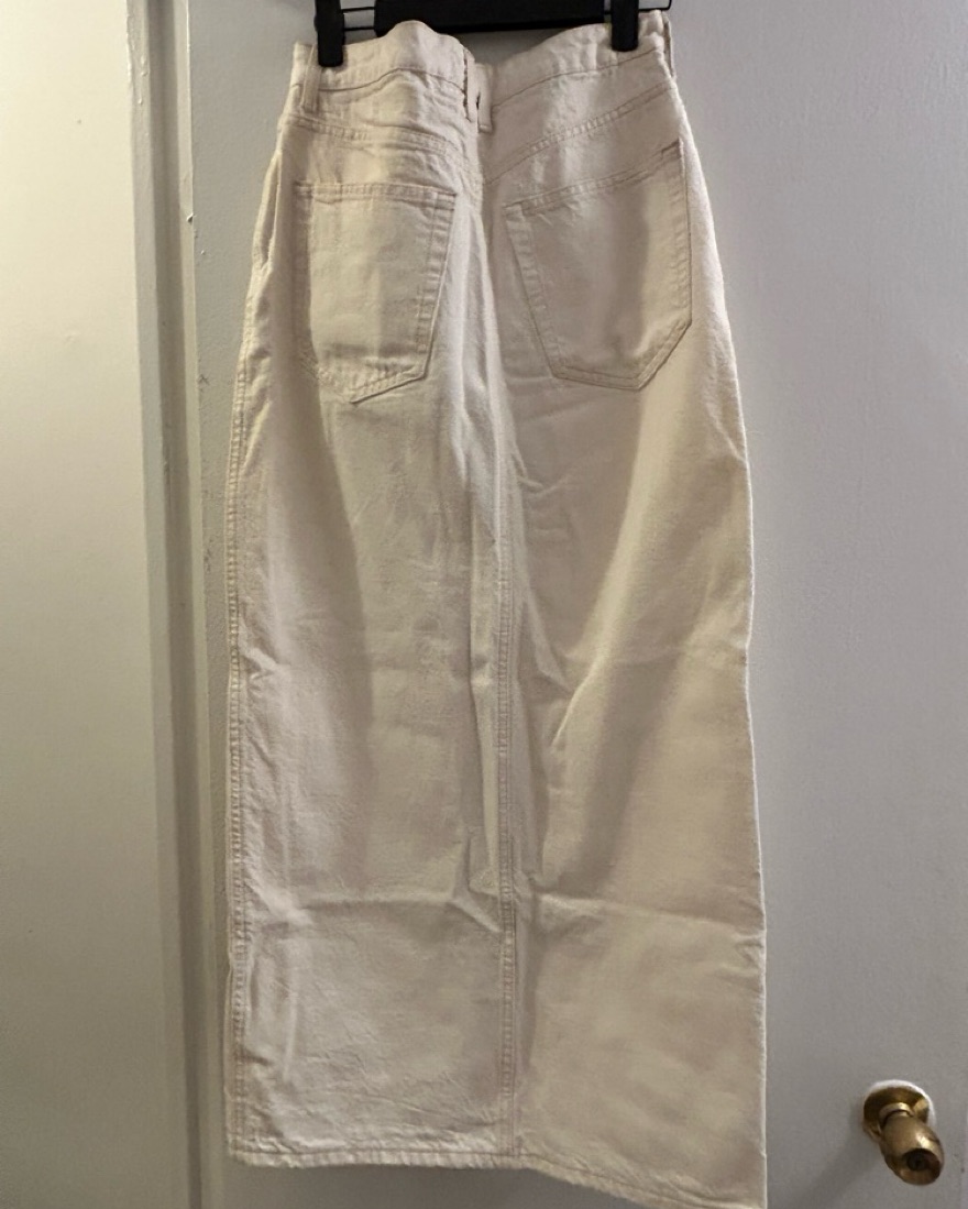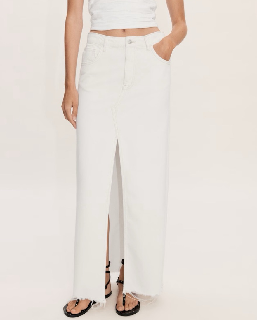 MANGO denim white midi skirt with a slit. Note: The bottom is not distressed like in the photos, just couldn’t find the exact on the Mango site but it’s the exact same as pictured on the model just with a closed seam at the bottom