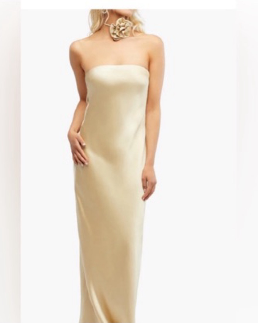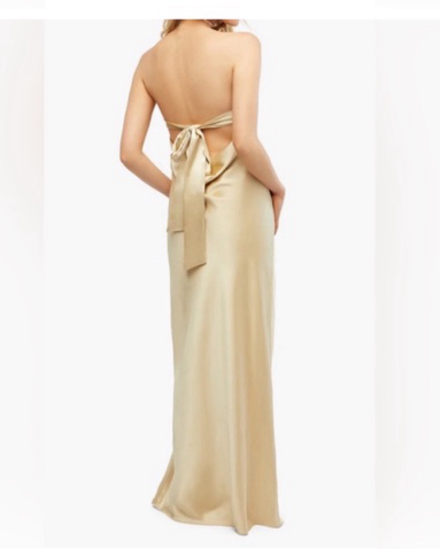 We wore what long gold dress. Adjustable in size with a tie back. Perfect for any event! I wore it for a rehearsal dinner.