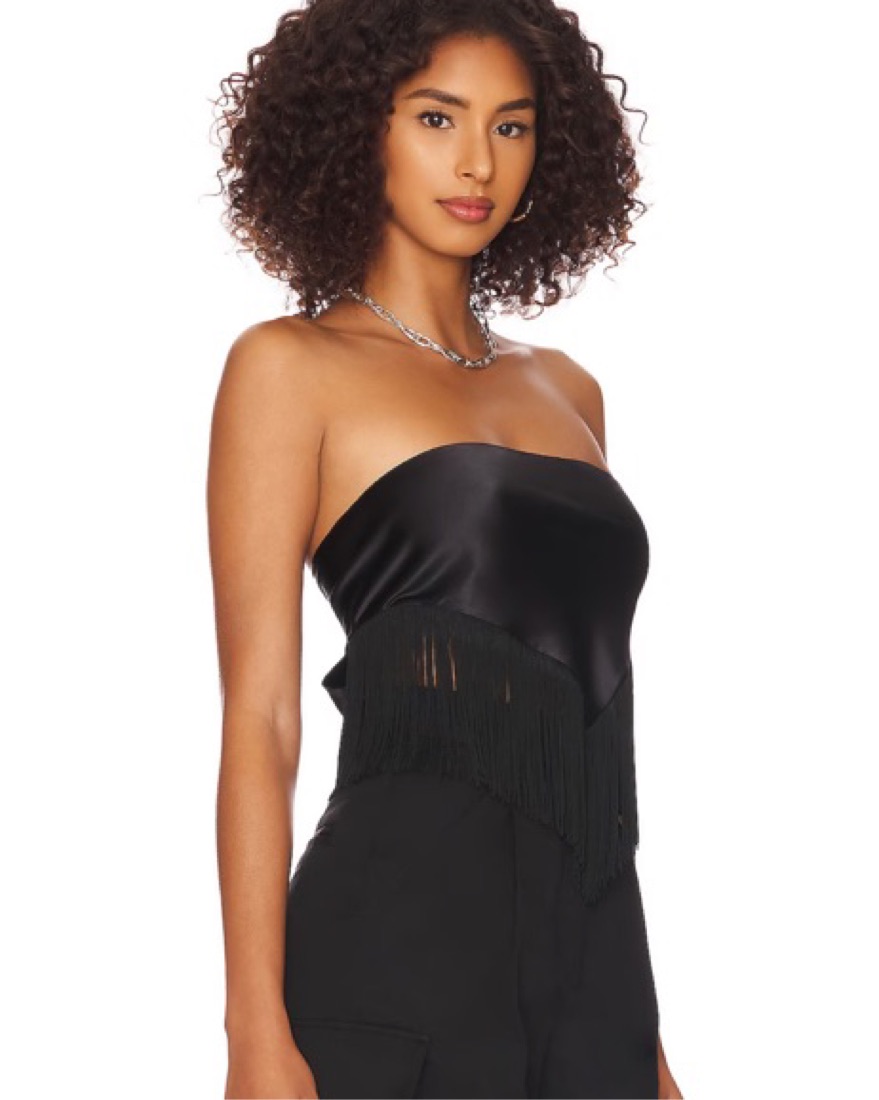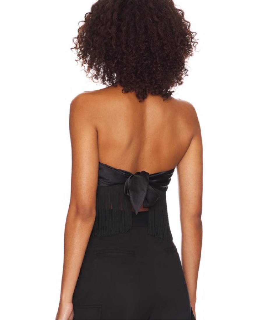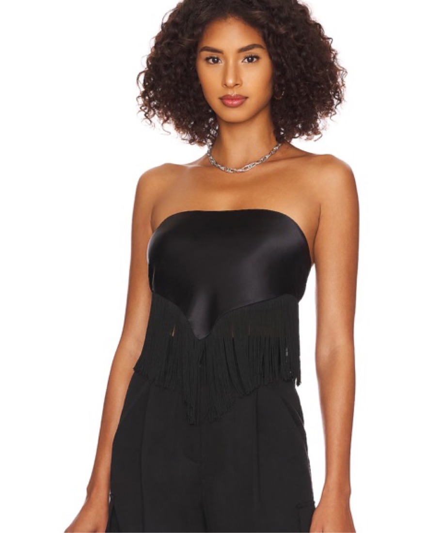 Lots of fringe trending this season 🥰 from revolve, black silk and tie back. Cute with black jeans or low rise midi skirt