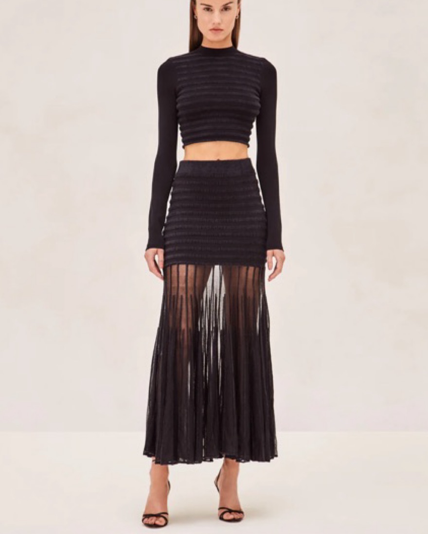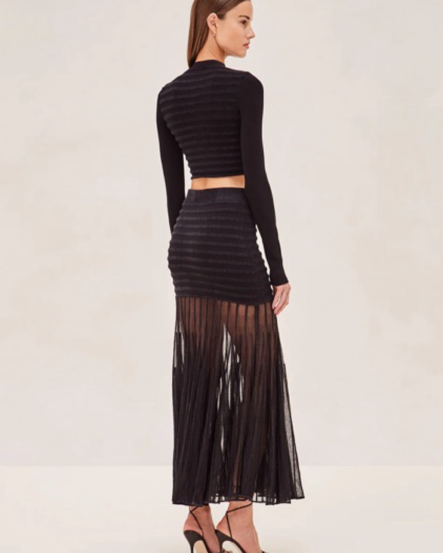 The Franki Skirt is a unique style with a mini skirt base and sheer overlay midi skirt, adding a touch of elegance. This skirt is detailed with line accents for a chic finishing touch. Pair it with the matching top for a sleek look perfect for a night out.