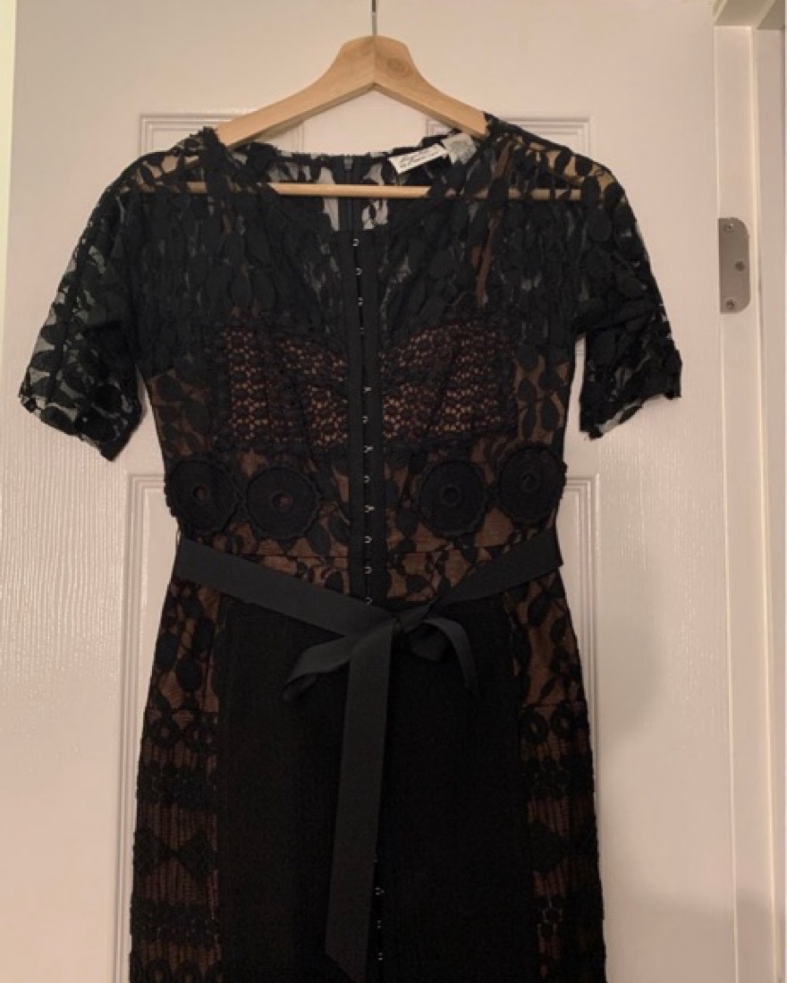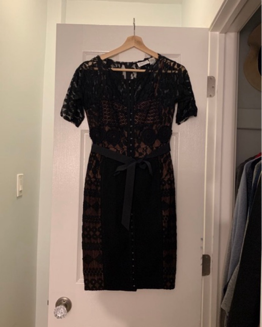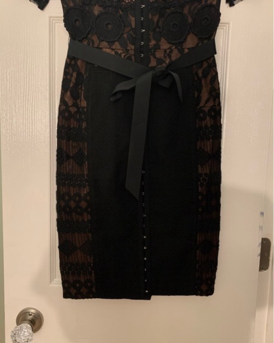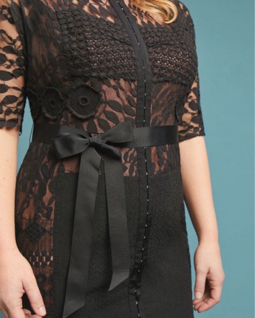 Expertly structured sensuously cut silhouette. Lace detail, removable belt, button front.