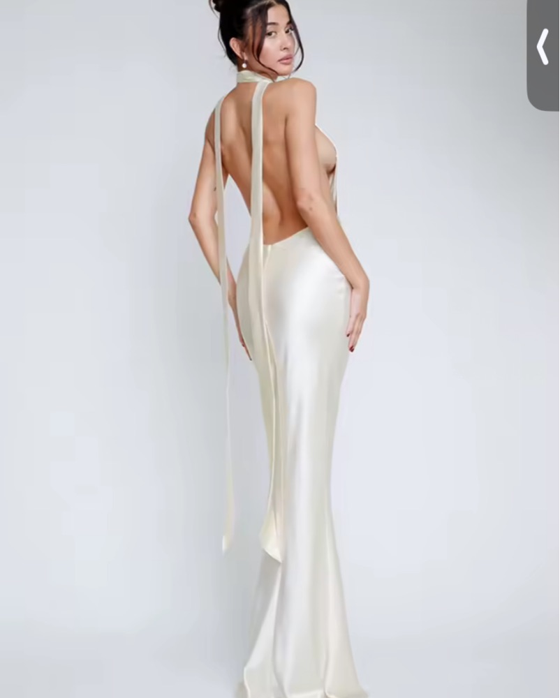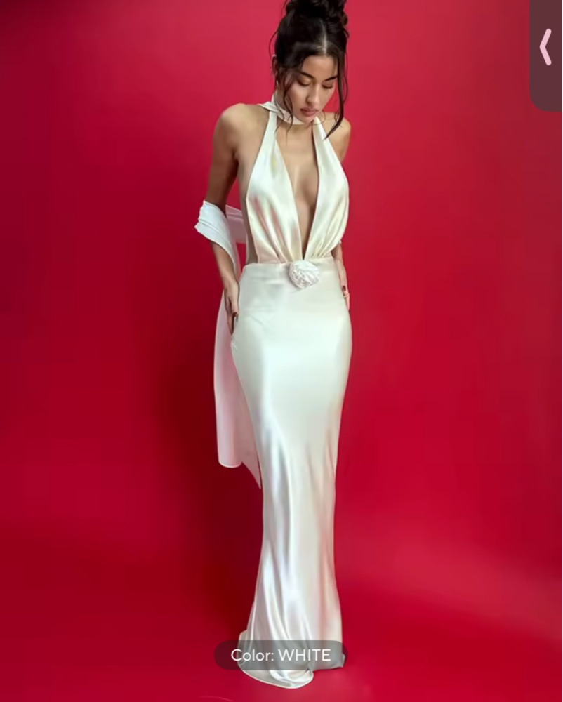 This stunning satin maxi dress is perfect for a formal event or special occasion. The open back and delicate rose detail add a touch of glamour and sophistication.