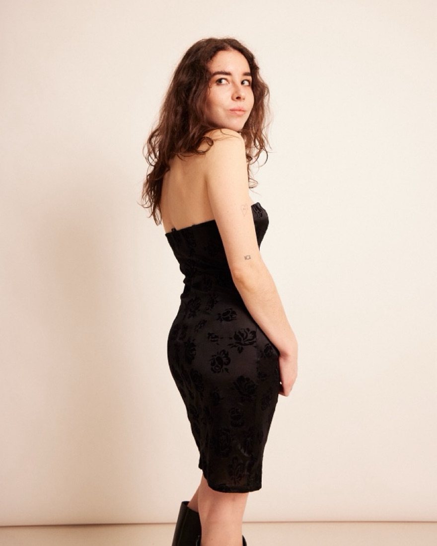 Beautiful and sultry dress with a velvet floral pattern❤️ Marked as a size 36B and has built in underwire - you can also attatch bra straps to this! Can work for a small or medium and has lots of stretch. Hits mid calf, model is 5’7 🎀 Pick up at Bedford Vintage in williamsburg brooklyn🪐