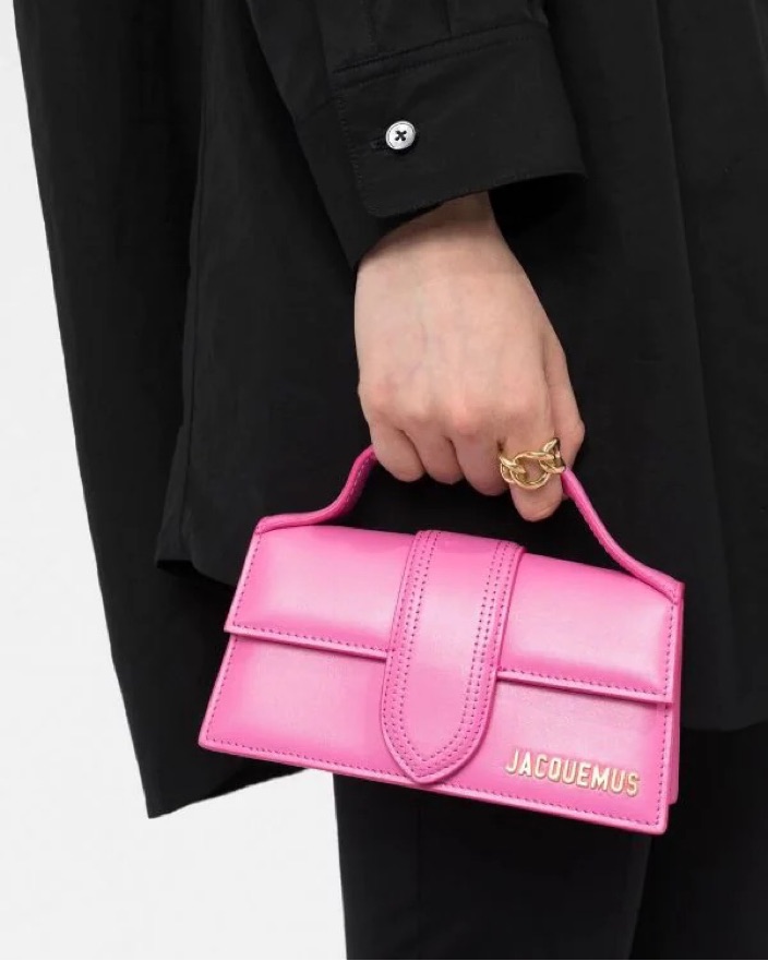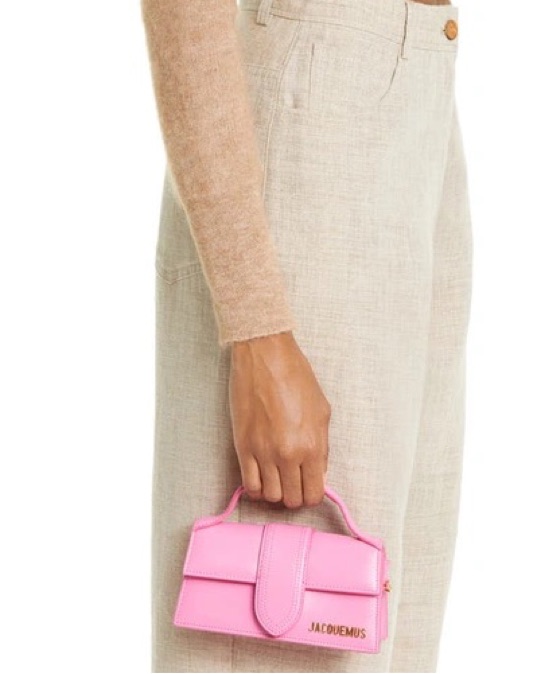 Cute pink Jacquemus bag (color looks more like the last two photos). Comes with a long removable strap. Can fit airpods, keys, and card holder (if you put it in slanted)