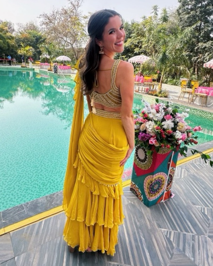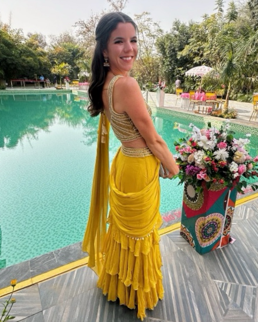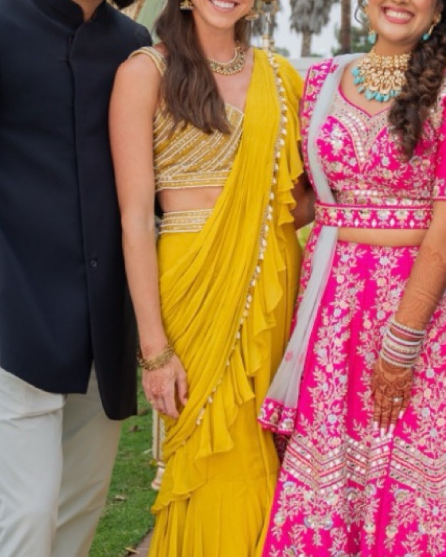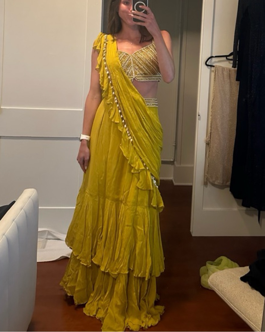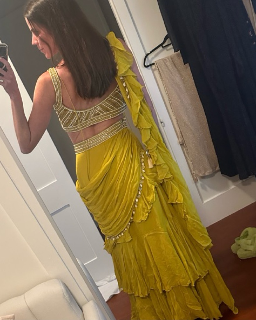 More fitted than traditional. Ruffle and seashell detail. Silver accents. Size 2-6