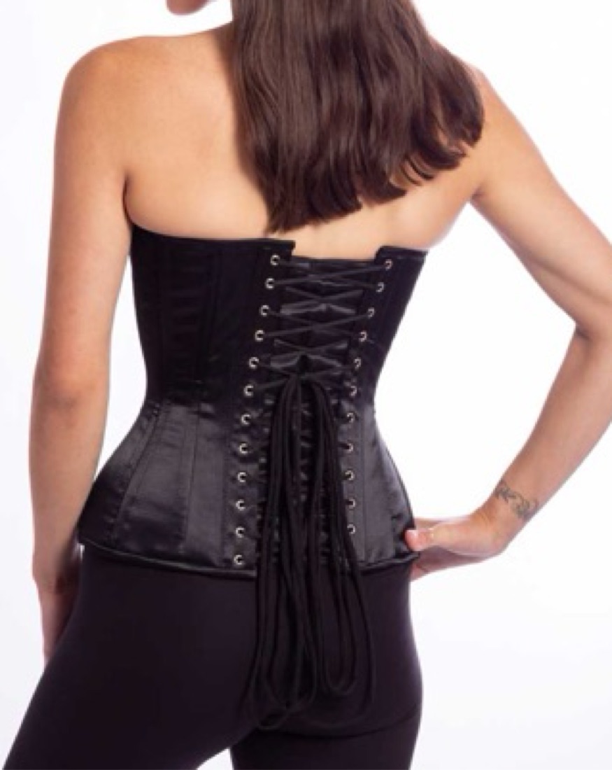Purchased from Orchard Corset in Manhattan. Snaps you in and also opens in the front. The back is laced up but also theres an extra flap to cover the skin if you’d like. XS/S