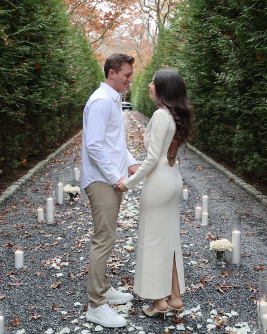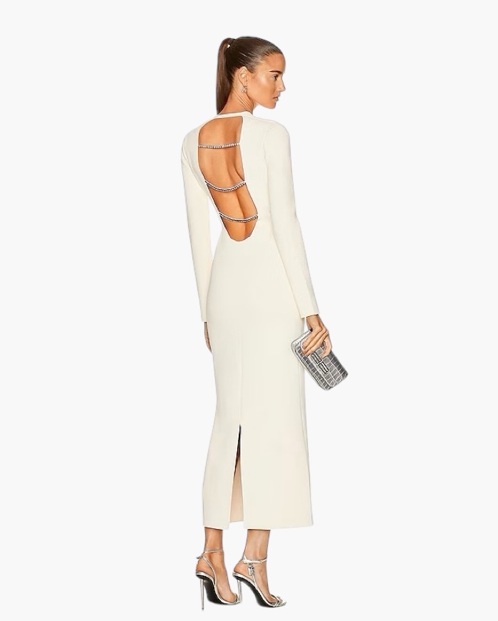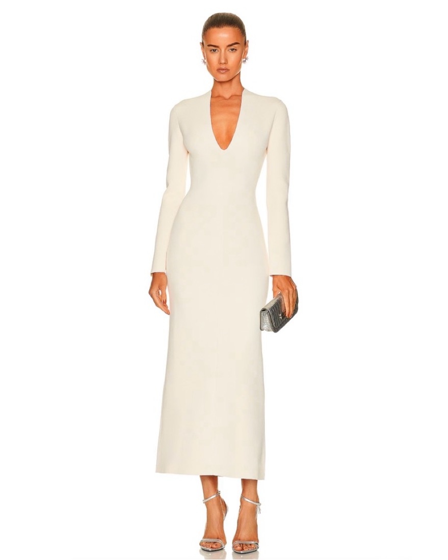 Renting my Ivory Khaite long sleeve dress called the Odette Dress perfect bridal dress wore once for my engagement and engagement photos best dress ever perfect for a black tie event or wedding events or bridal shower or engagement photos