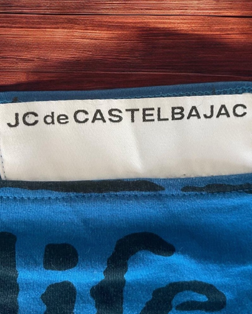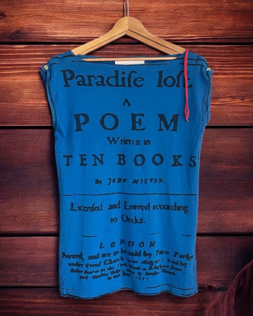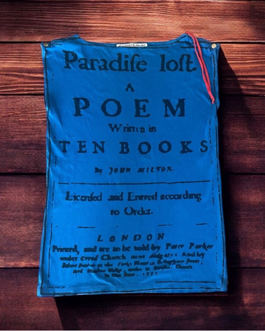 Rare Jean-Charles de Castelbajac collectible blue electric tee shirt dress from late 2000searly 2010s featuring John Milton’s book cover printed in the front: Paradise loft, A poem, Written in 10 books by John Milton (published in 1667) …