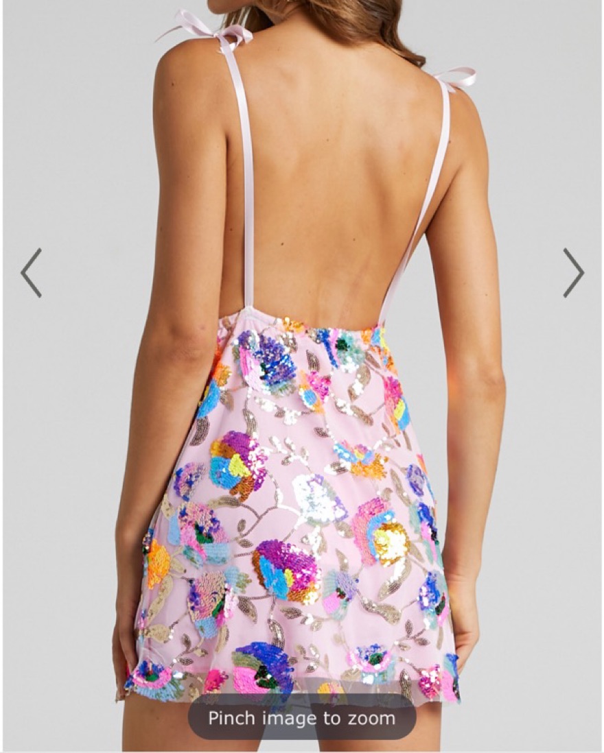 Catch the light in the Garden Of Eden Mini Dress! This fun and fabulous mini is made from mesh and is embellished with vibrant sequined florals for an uplifting mood! It’s cut with self tie shoulder straps that frame its plunge neckline then flares into a subtle A-line skirt and finishes with a bare