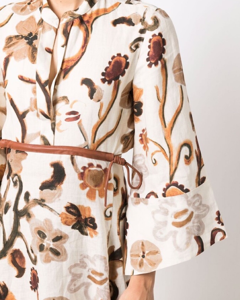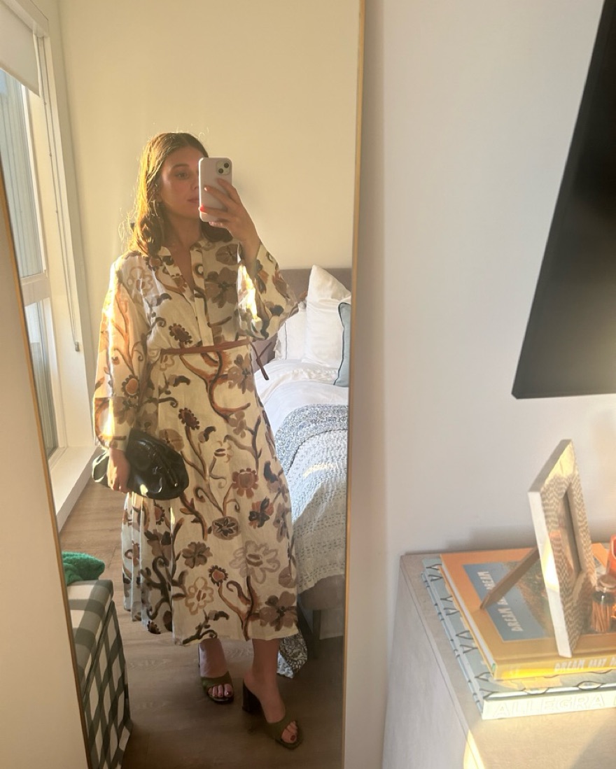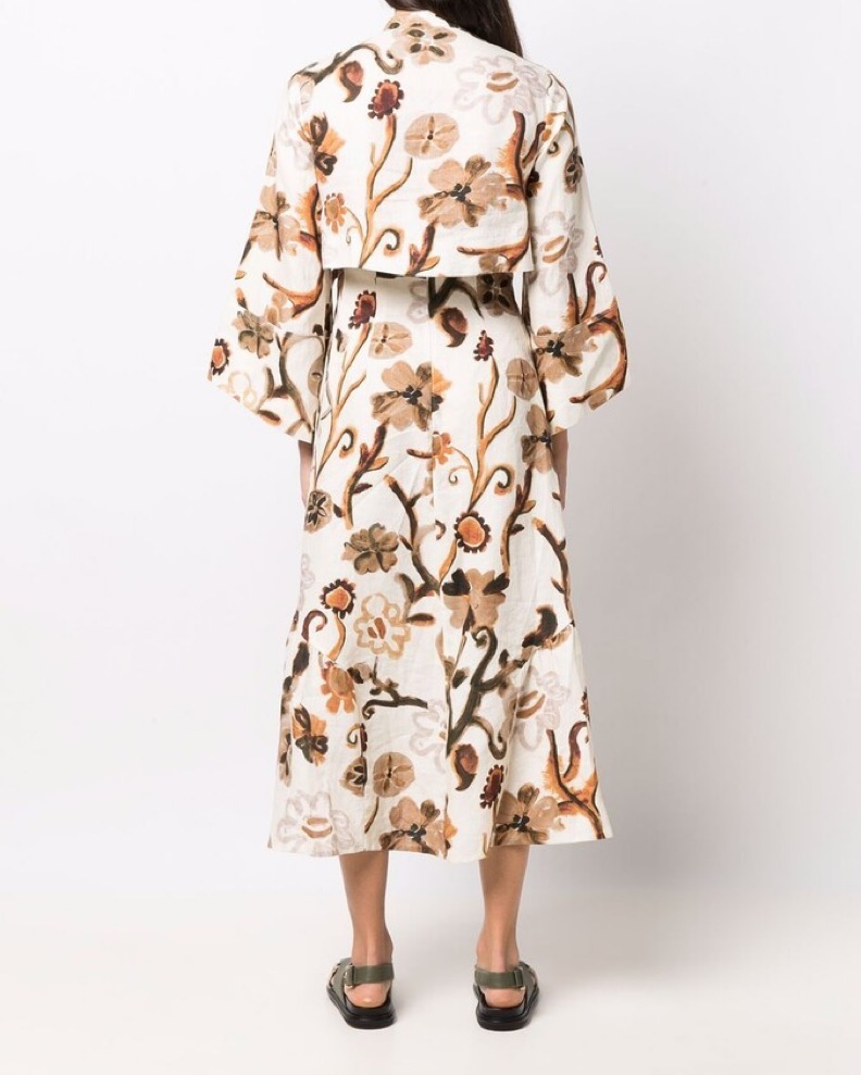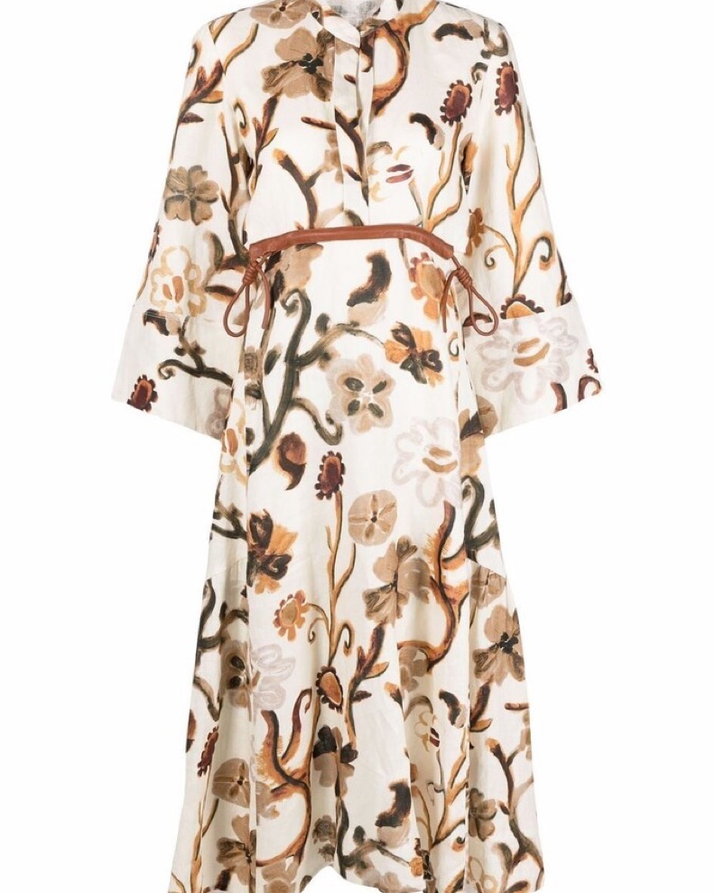 Size S. Long printed brown and white linen dress with leather accents. The back (my favorite part!) is designed to look like two pieces, but it is all one dress. Can be styled for any season. Worn twice, in like-new condition.