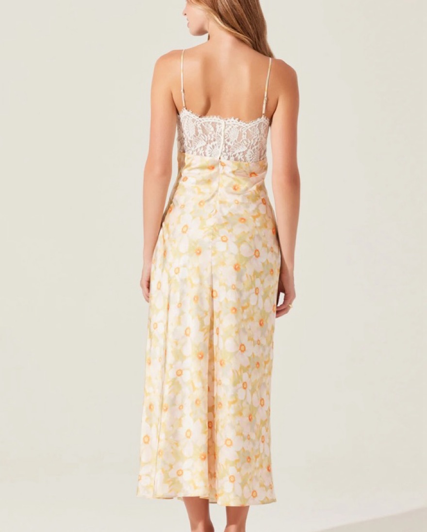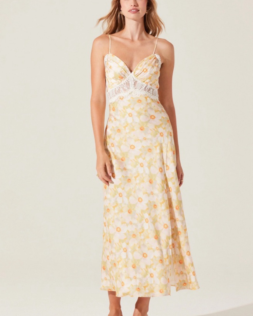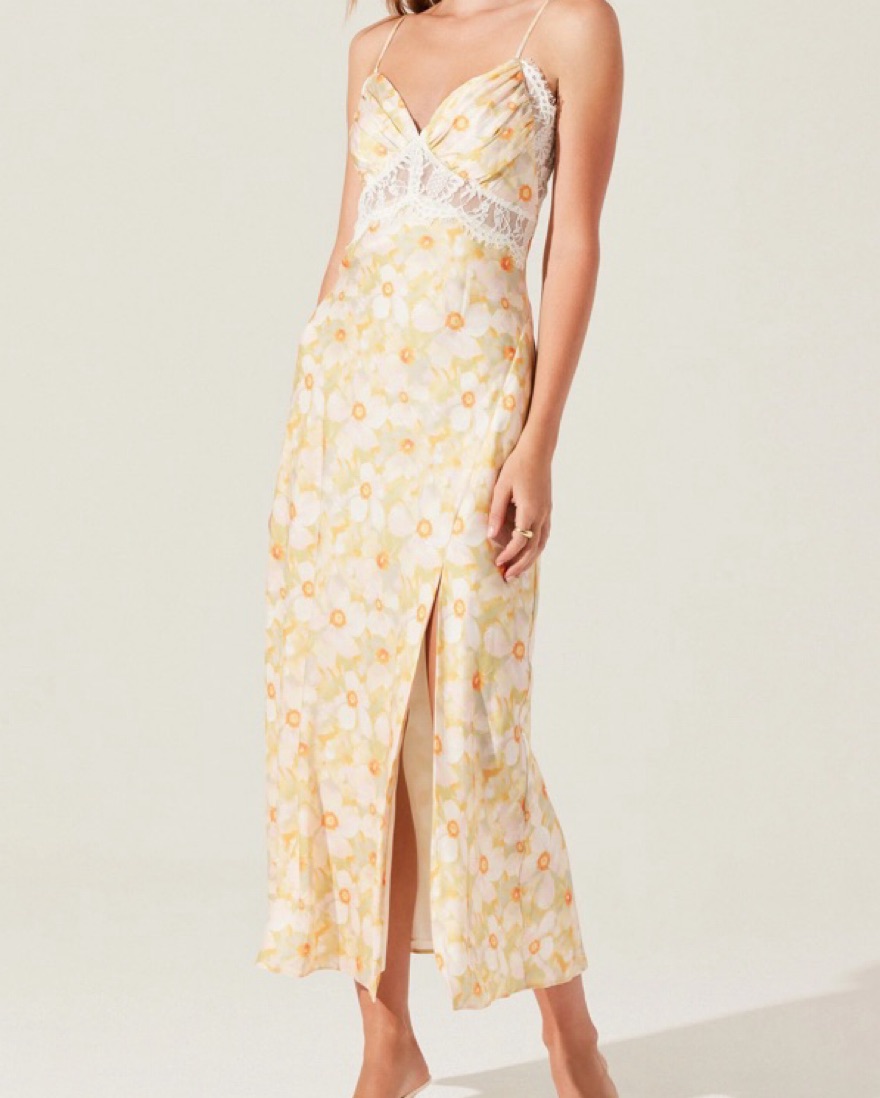 This stunning maxi dress is perfect for a summer wedding or garden party. The floral print and lace detailing add a touch of elegance.
