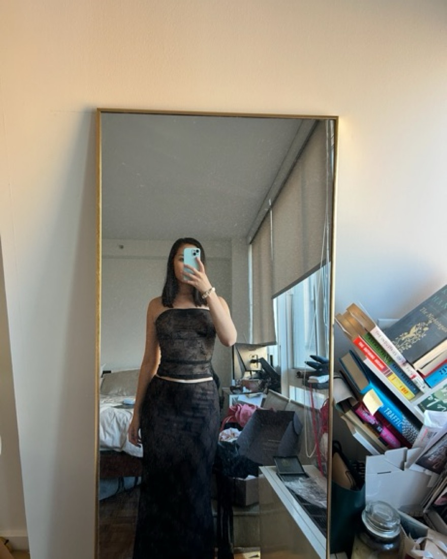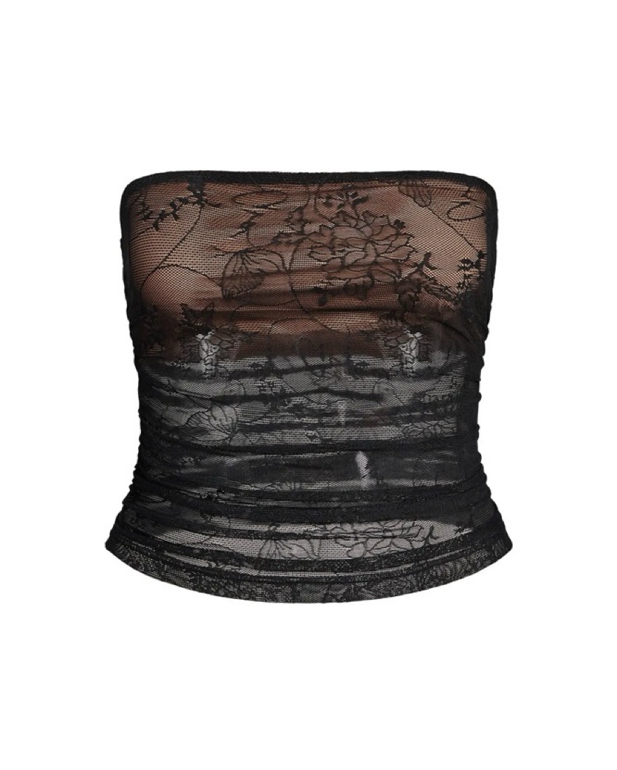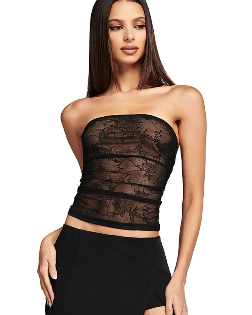 Black lace strapless tube top in custom 'GIA' Butterfly Lace. Size M but runs a little small so fits more like a Size S. Have a matching maxi skirt as well (pictured in last pic) on my page which is from Tiger Mist in size S but looks exactly the same and matches perfectly