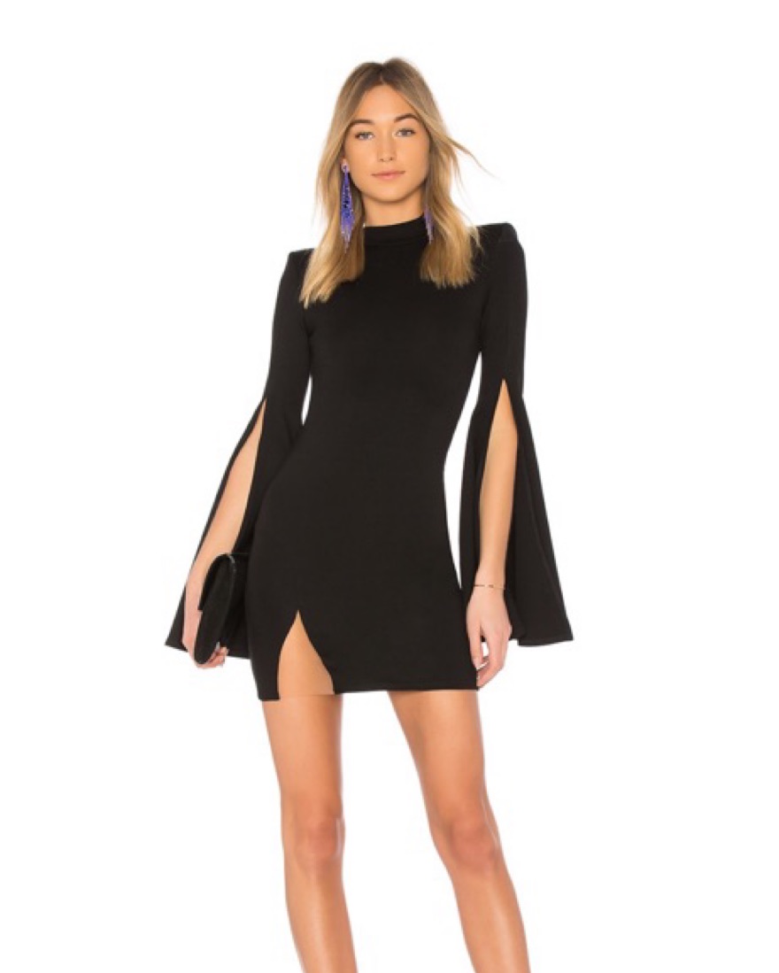 Black reviolve dress with shoulder pads and accentuated sleeves. Super cute for a more formal dinner or event