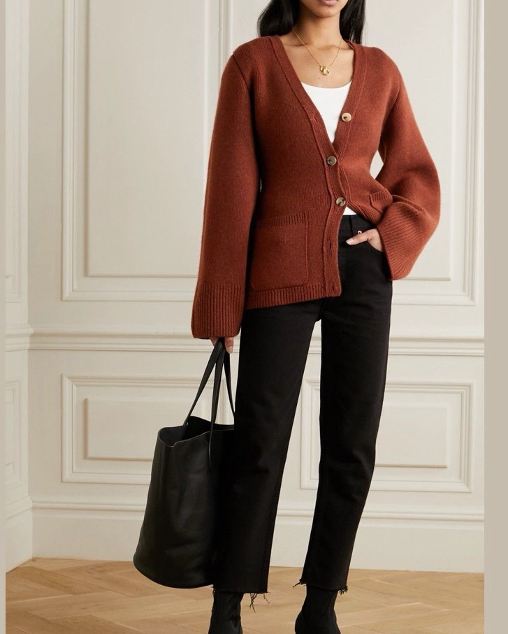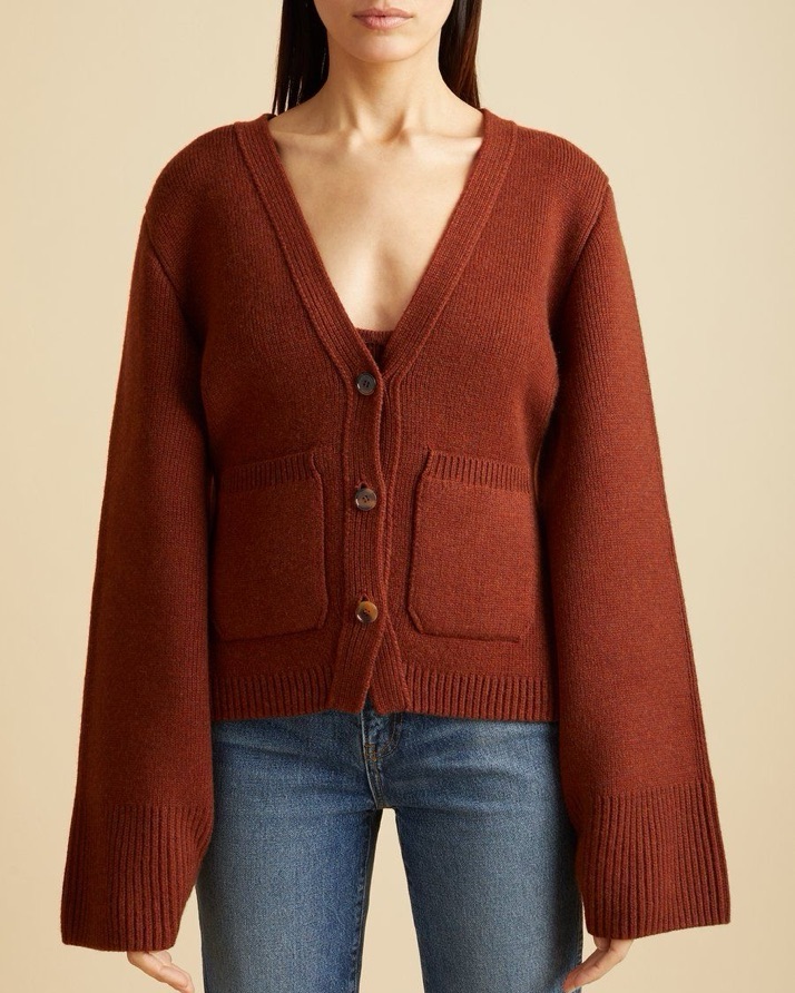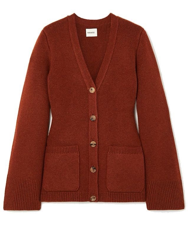 The cashmere Lucy cardigan by Khaite. Retails for $2,000 and this color is sold out! 5 buttons. Gorgeous burnt orange / brown color. thick cashmere. Price reflect dry cleaning :) Please be careful - damage will incur fees as this is a pricey item. Tags: Fall outfit, the row, toteme.