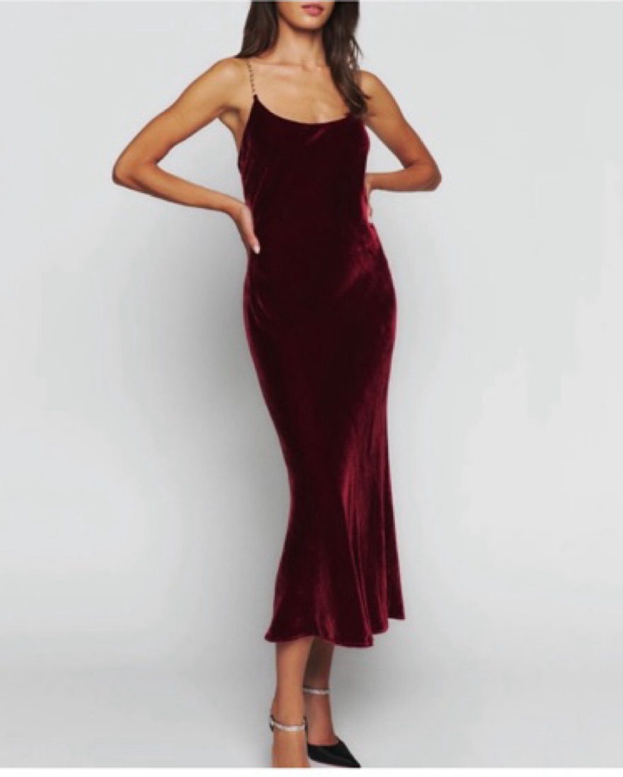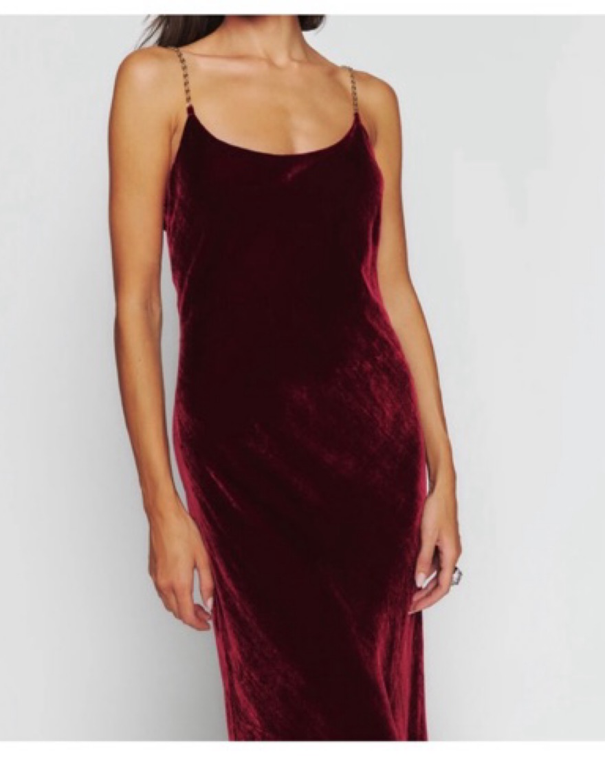 Super beautiful and luxe velvet deep red midi dress. Gold chain straps (adjustable). Tag says XS but it fits a S