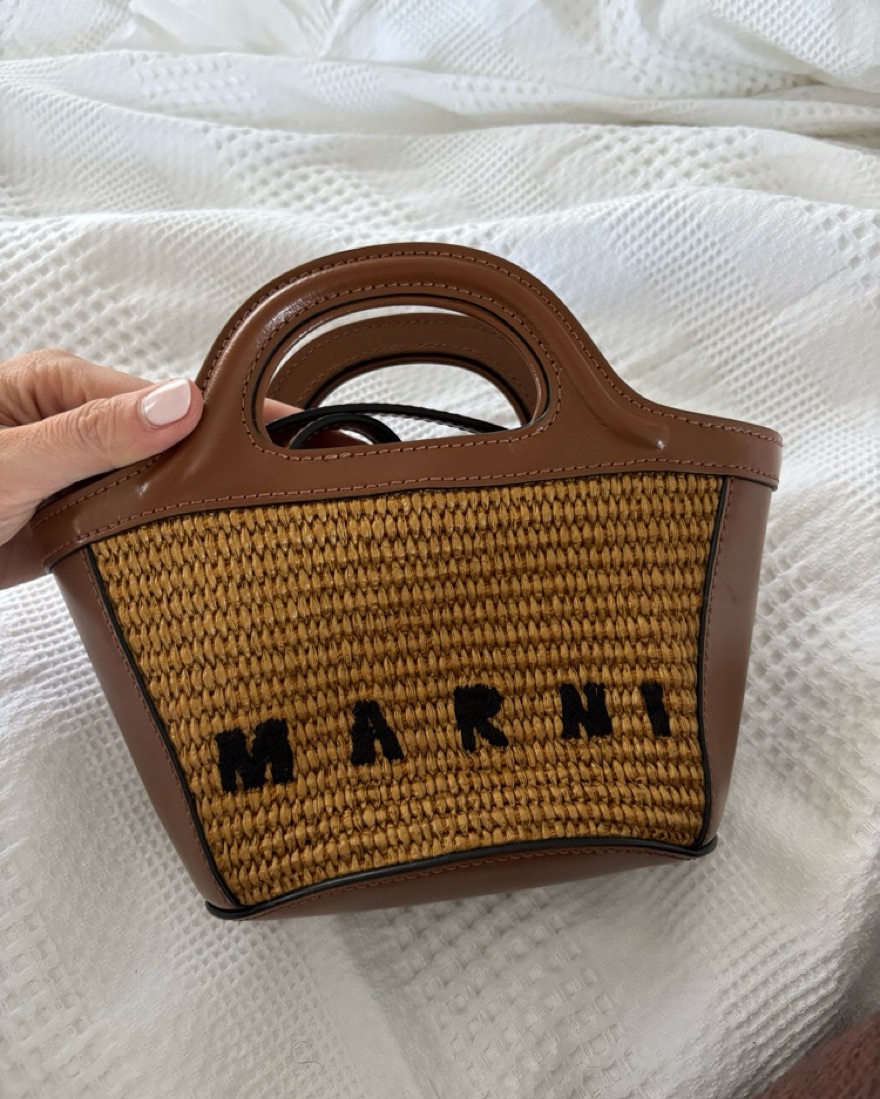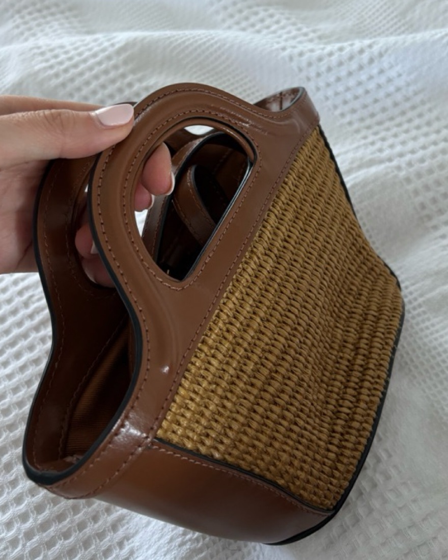 Beige small bucket bag. Snap closure. Adjustable and removable strap