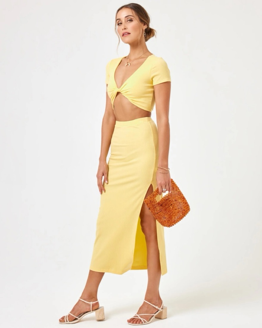 brand new, never worn! super soft and stretchy. butter yellow skirt and top set