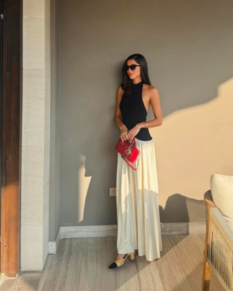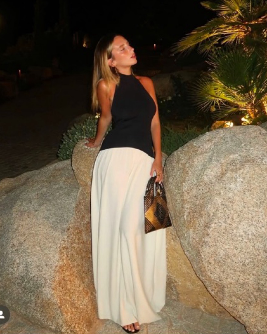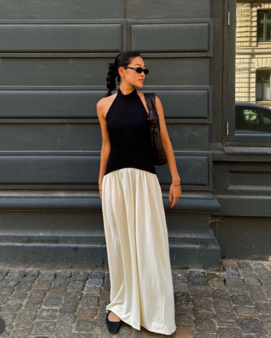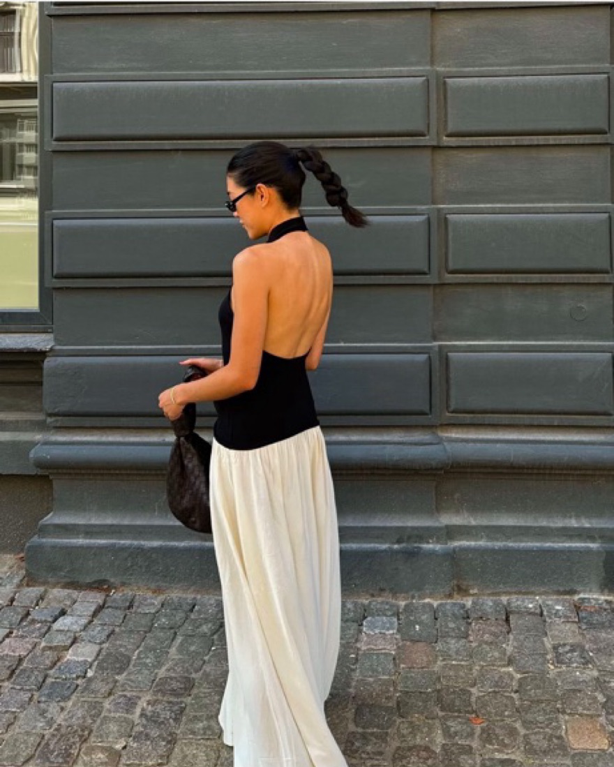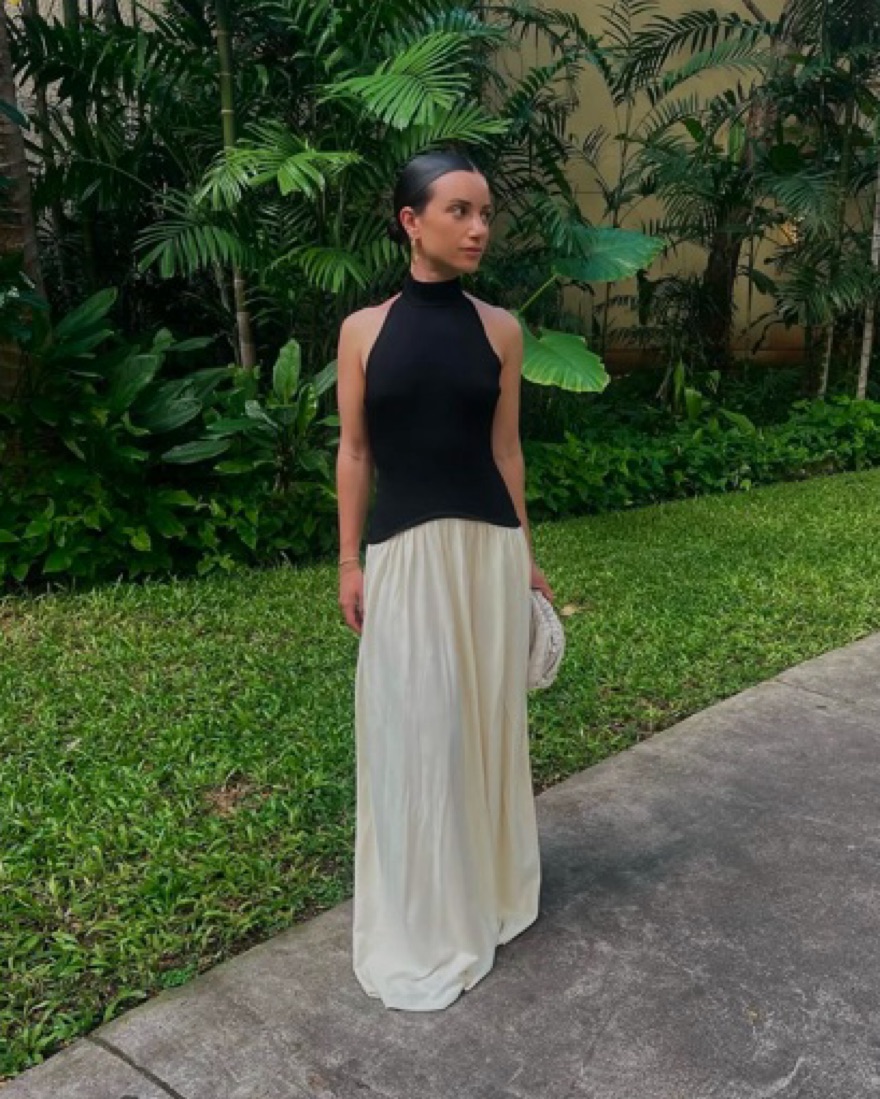 Solid and striped halter soglio dress in ecru noir (XS). Maxi dress with a black fitted halter top and lightweight knit cream skirt. Open back and drop waist