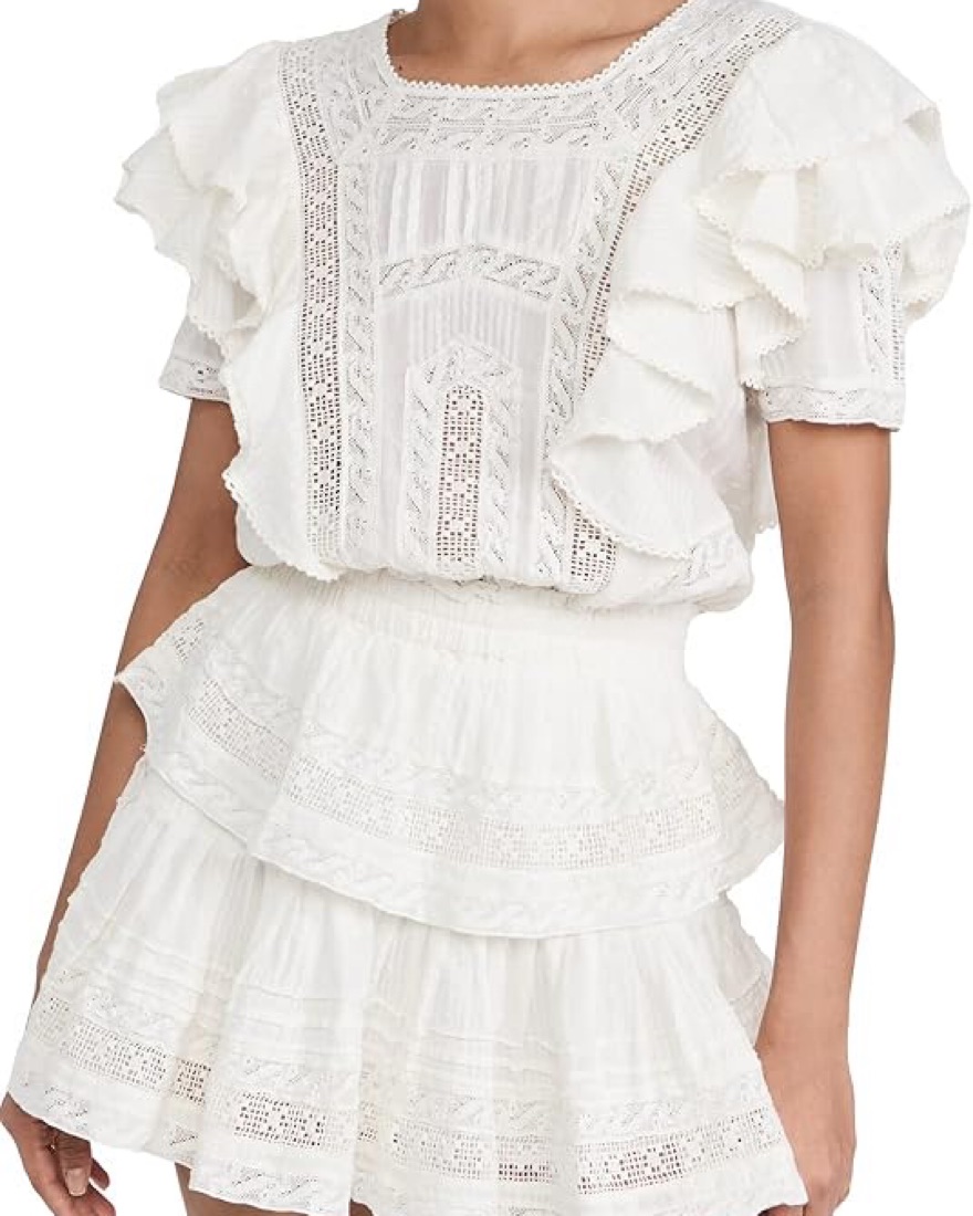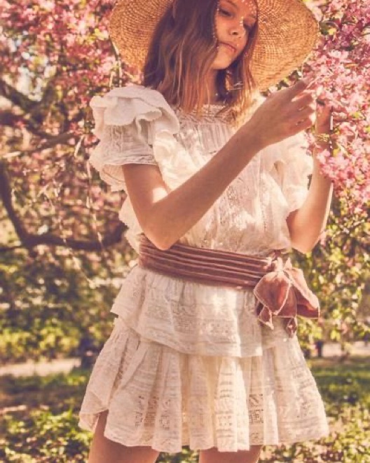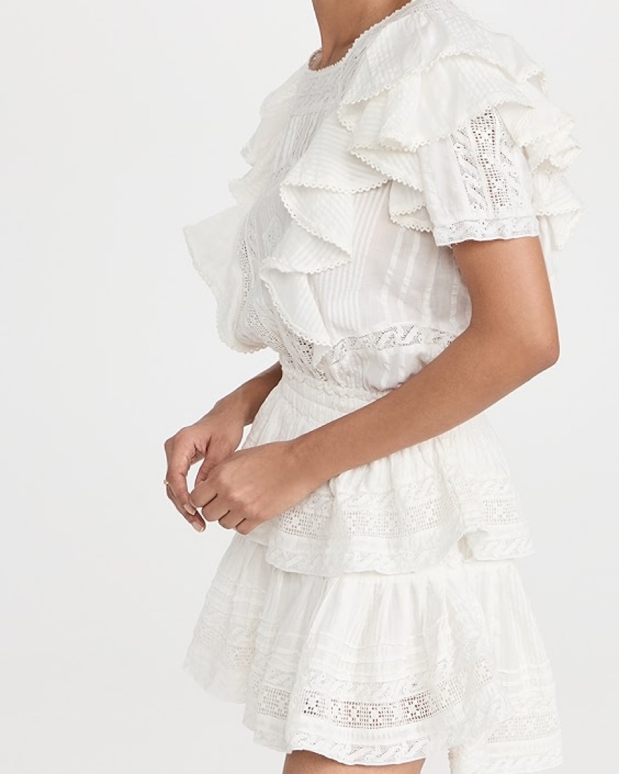 Desert Victorian fabric elevated with subtle textured stripe and little ikat print. Custom lace. Short, fitted sleeve with flouncy ruffles cascading down princess seams. Pointed inset laces on bodice and ruffle mini skirt.