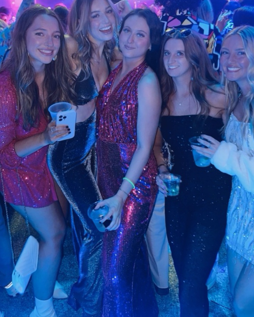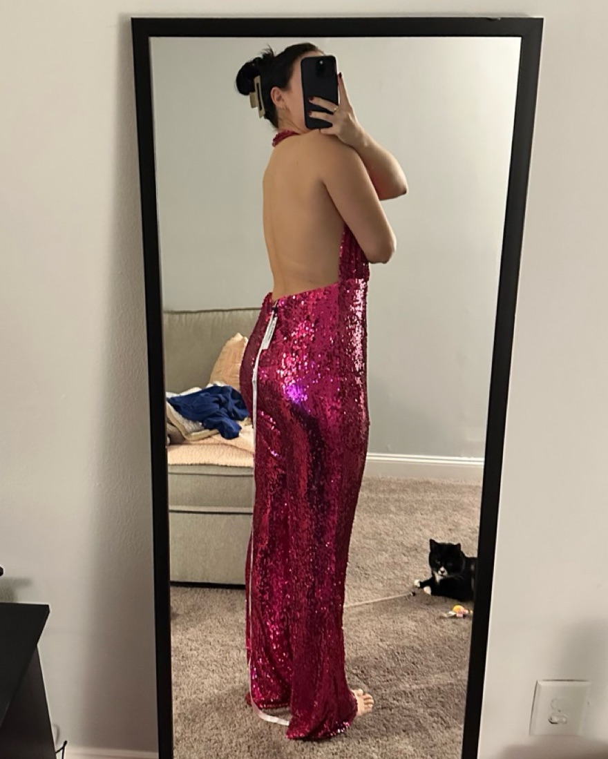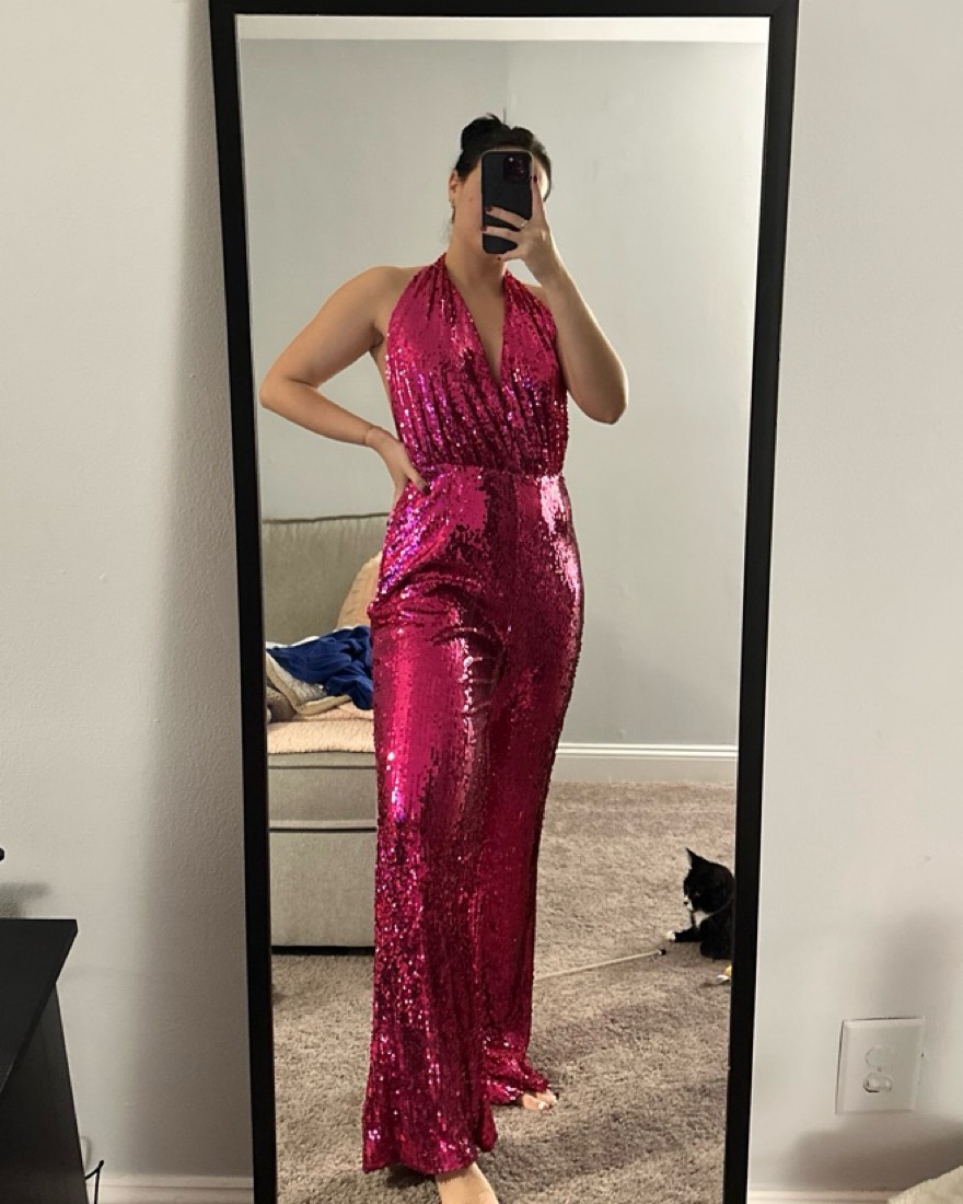 Nasty Gal pink sequin jumpsuit, deep v with open back & flared bottoms. Perfect for birthdays, bachelorette’s or disco themed parties!