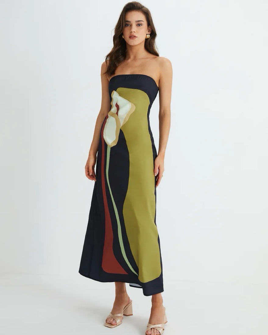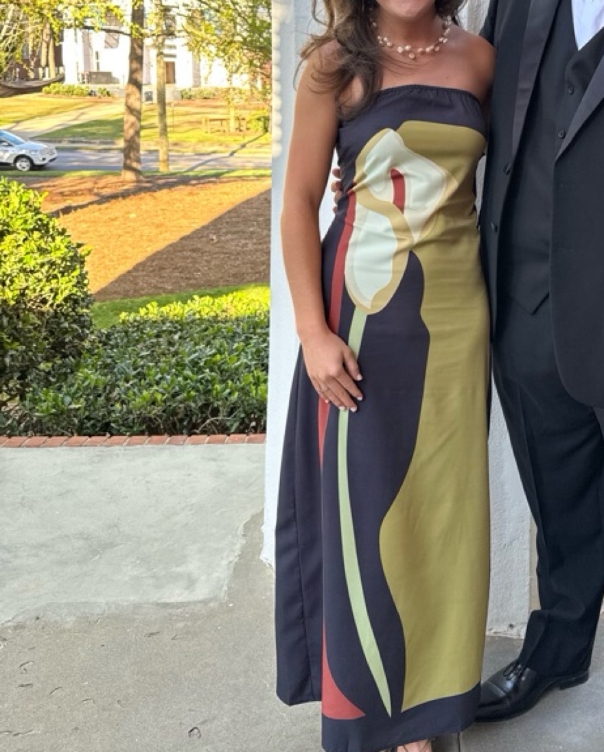 One of my favorite dresses!! Even though it’s strapless the dress doesn’t fall down. Zipper on the side. Easy to steam.