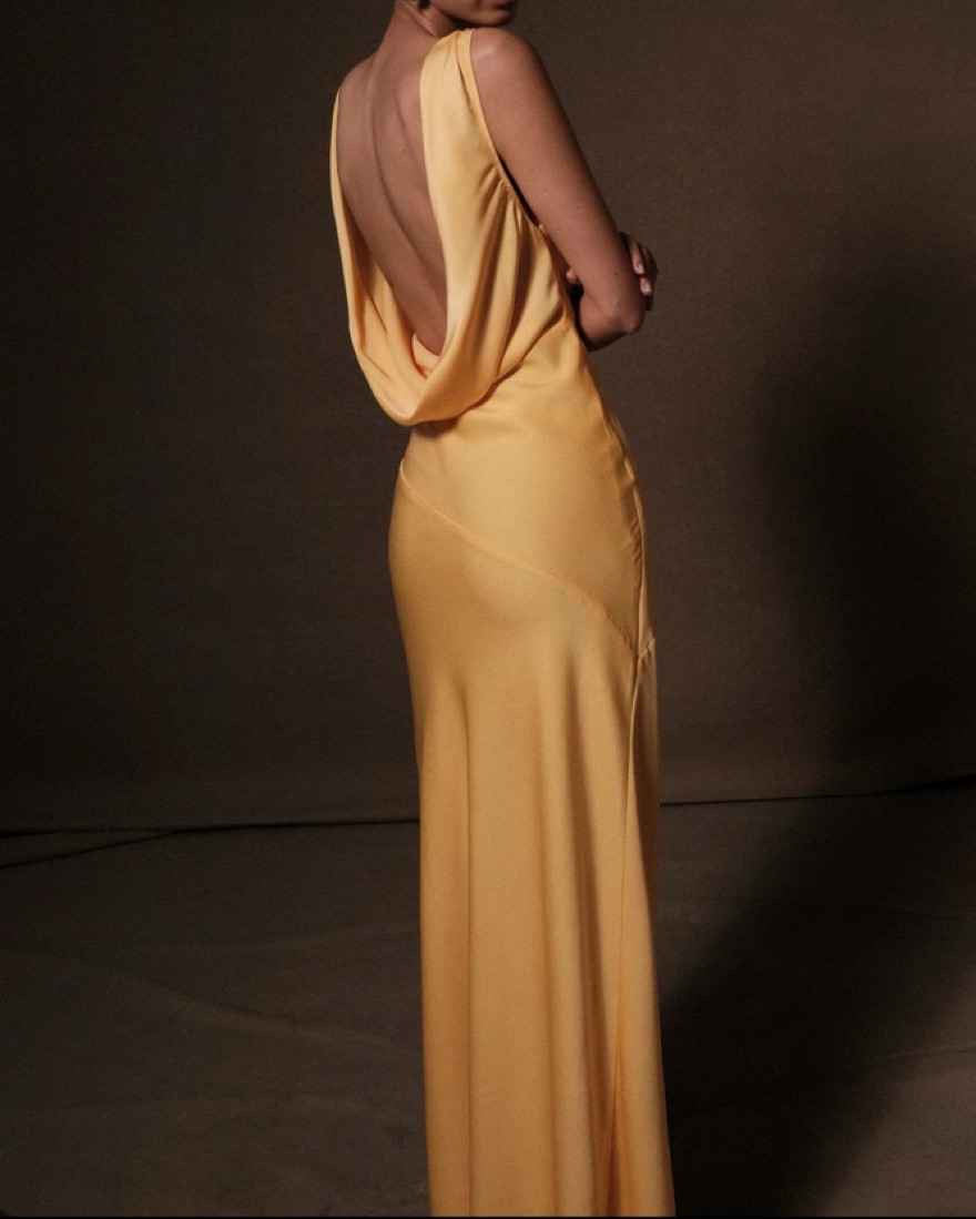 This stunning yellow gown is perfect for a formal event or special occasion. The backless design creates a chic, elegant look.