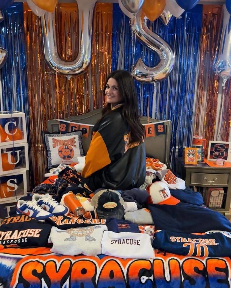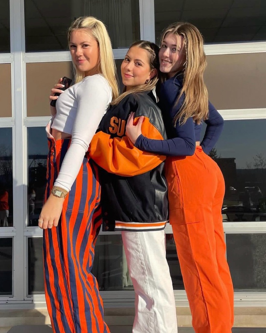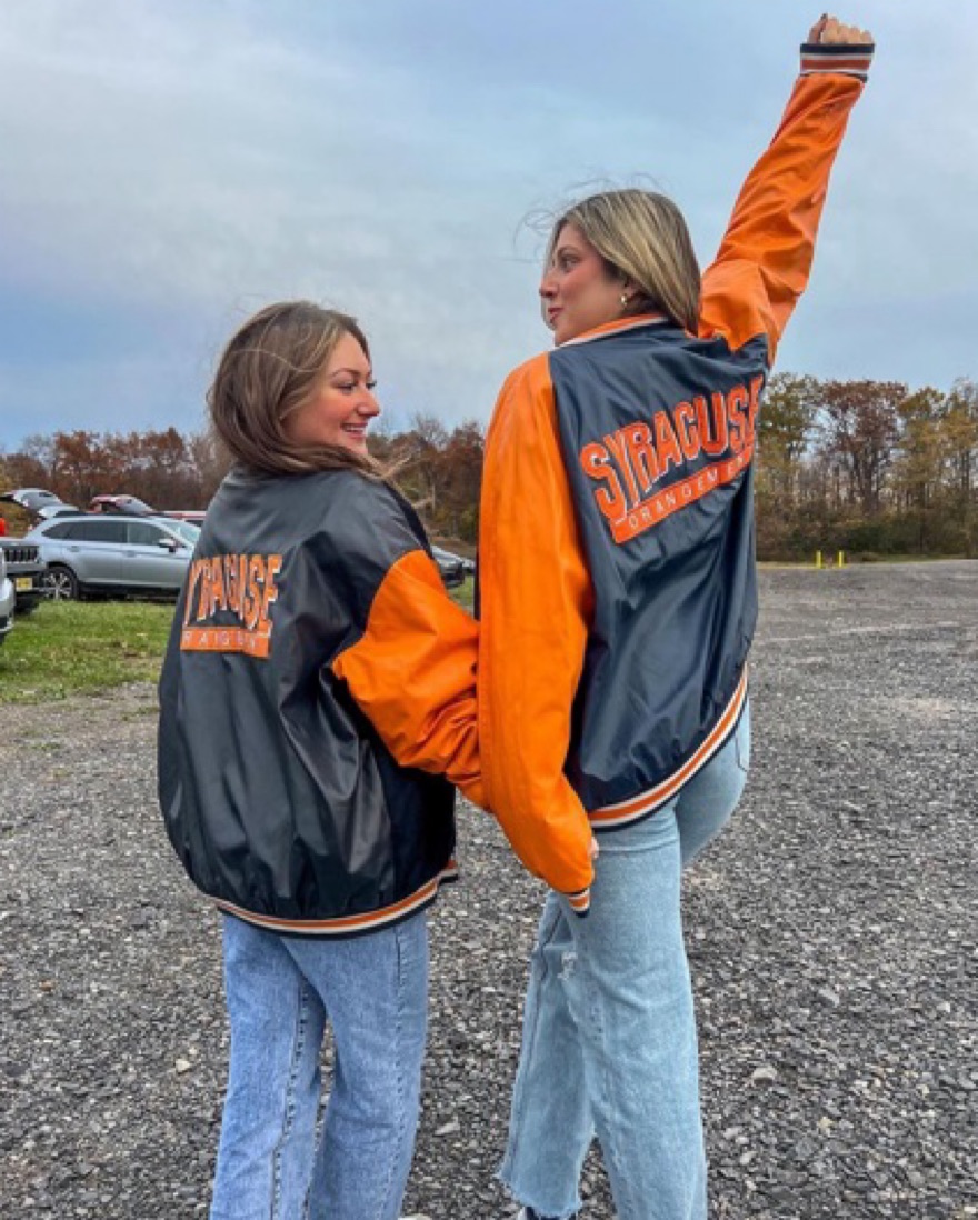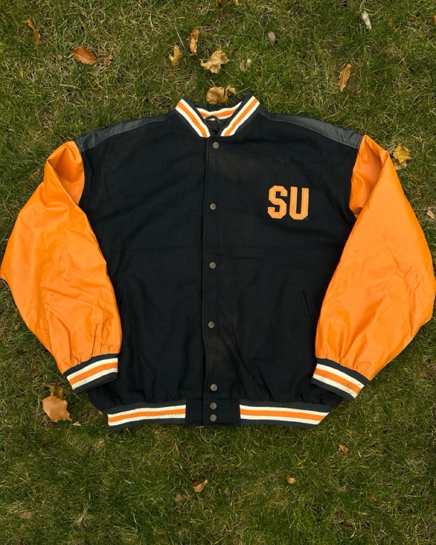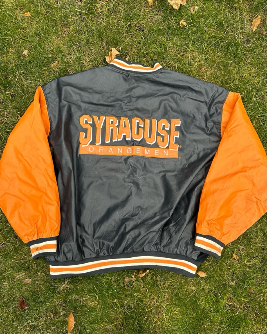 Syracuse University vintage navy jacket with orange sleeves, sourced by Tailgate Teens on Instagram. Whether you’re getting ready for an upcoming tailgate or looking to elevate your street style with a sick vintage piece, this is the perfect piece for you. Go Orange!!!