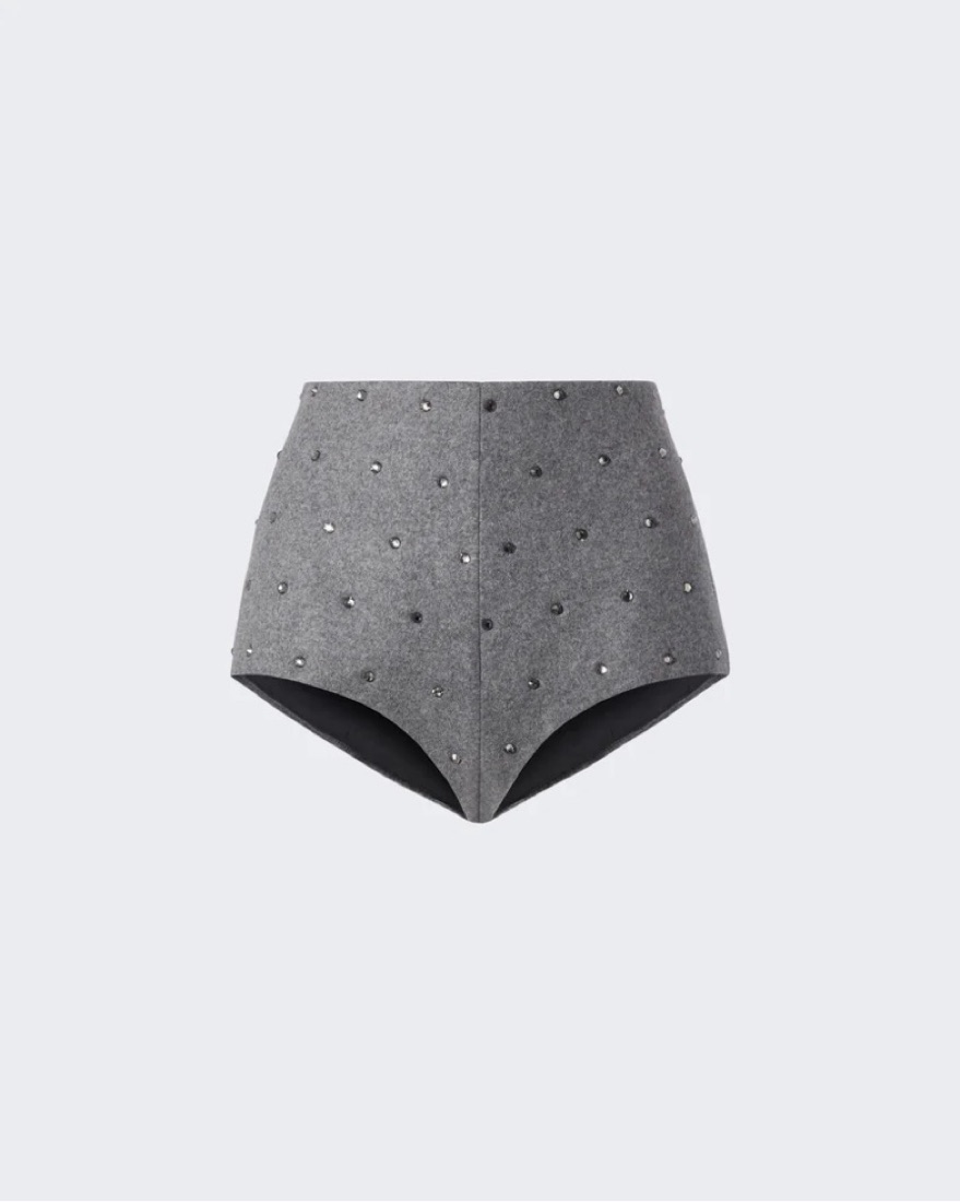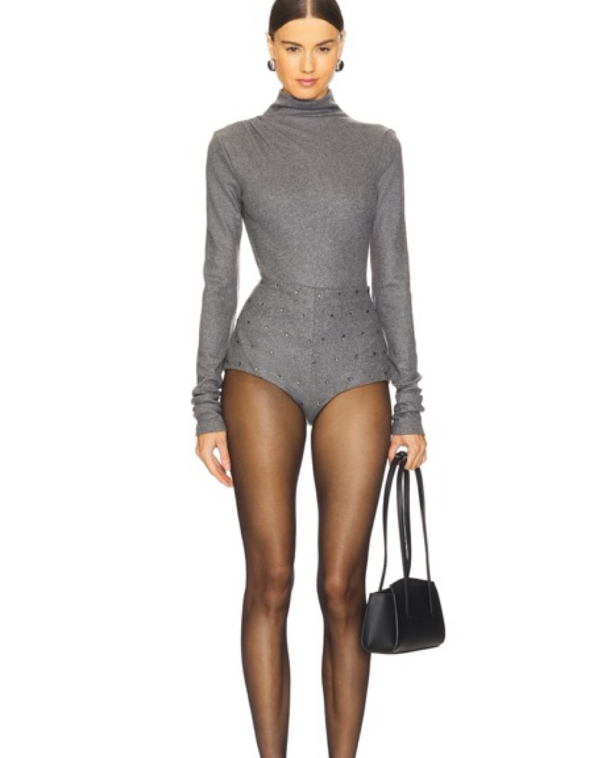 Top in size small, shorts size medium- fit somewhere between a small and medium. Micro shorts and backless top. Grey color