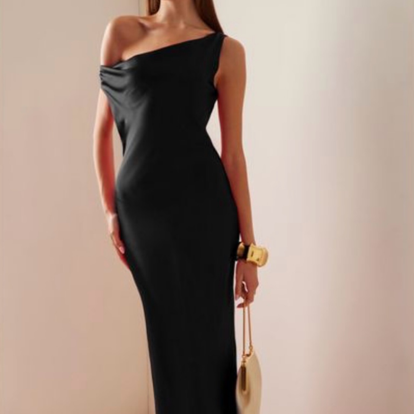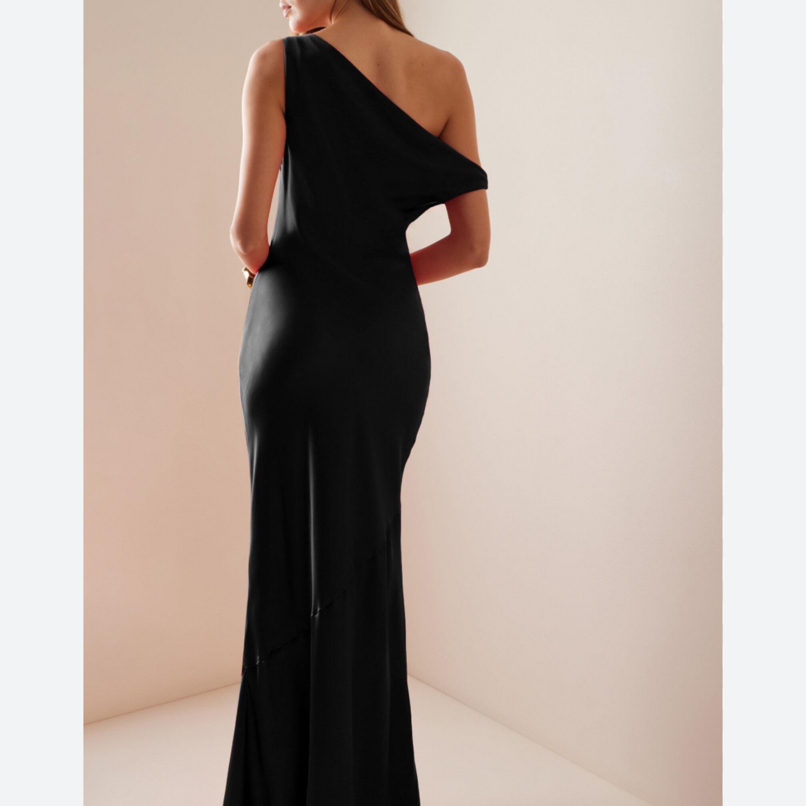 Black Staud satin maxi formal dress with asymetric shoulder detail