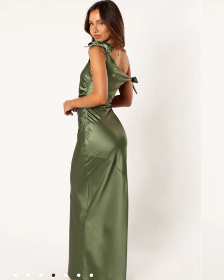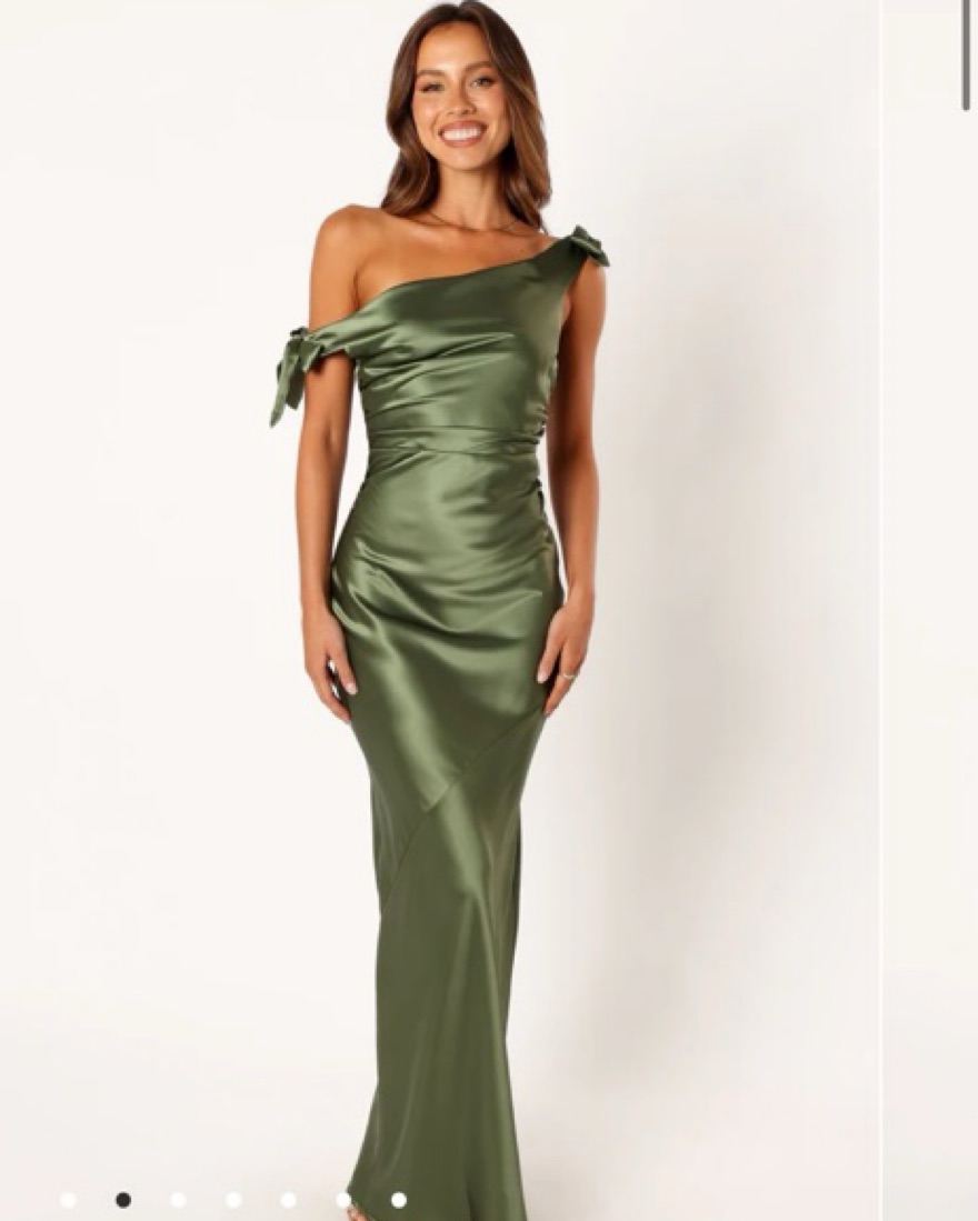 Worn Once for wedding! This stunning satin maxi dress in a rich olive green color is perfect for a formal event or special occasion.