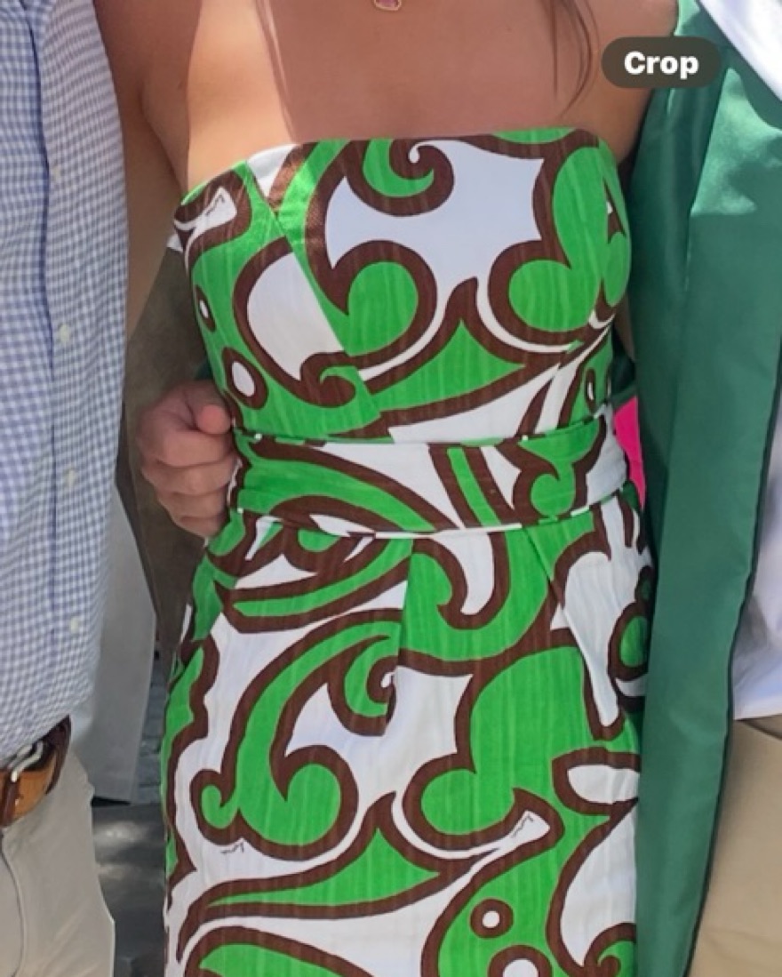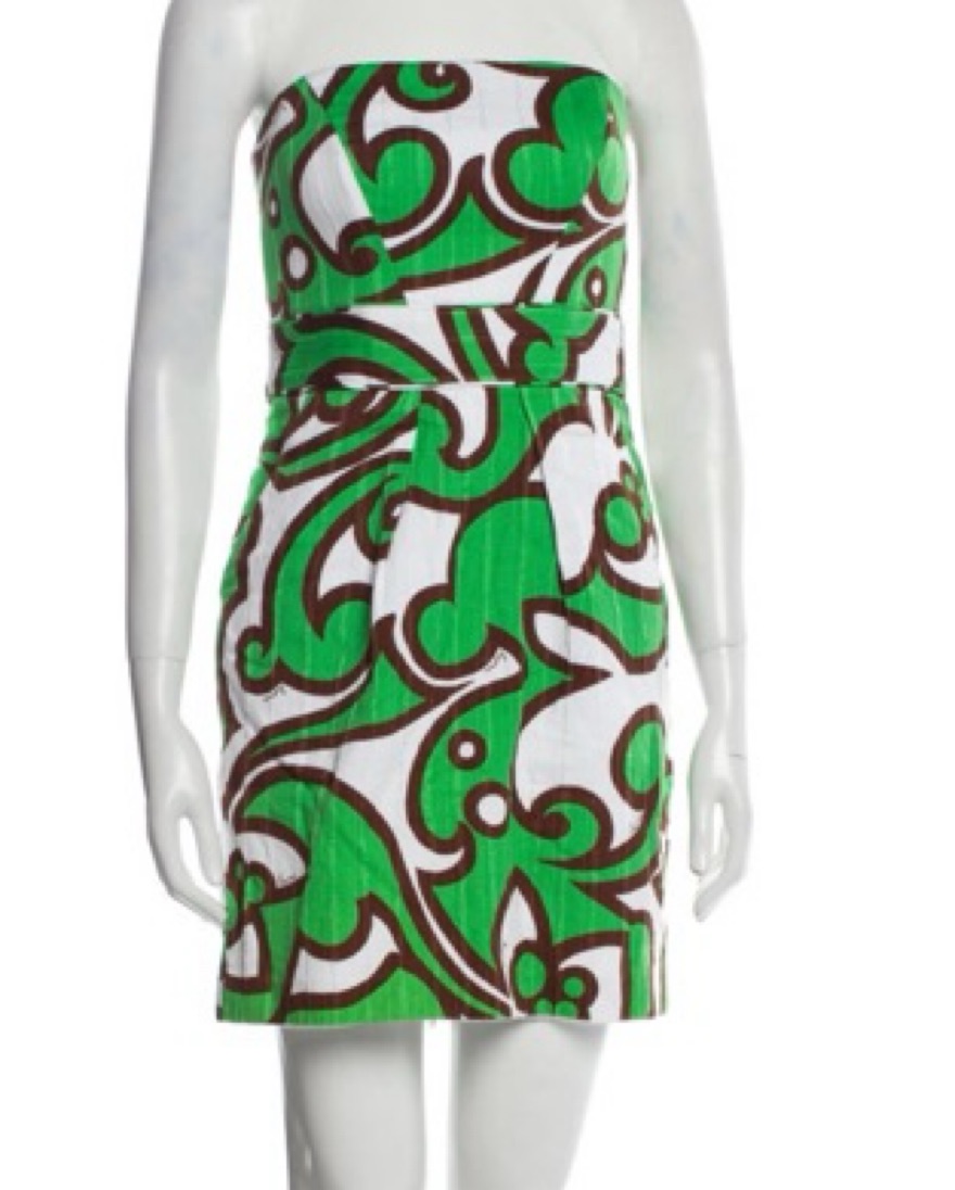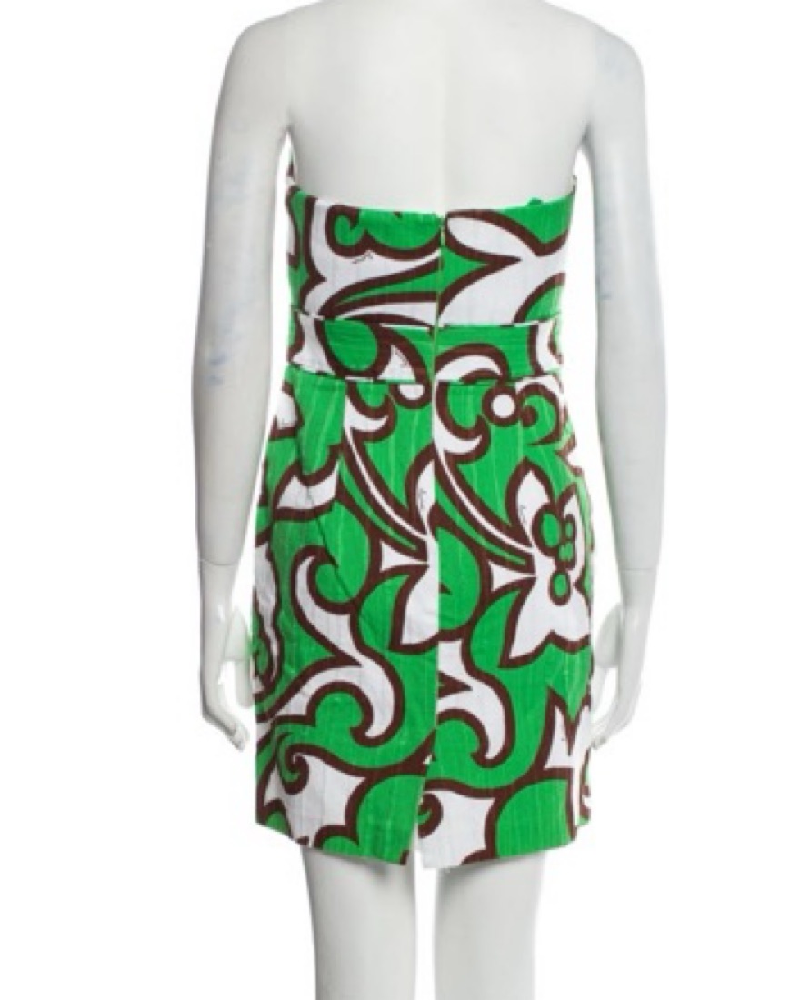 This vibrant, strapless dress features a bold, eye-catching graphic print that is perfect for a summer party.
