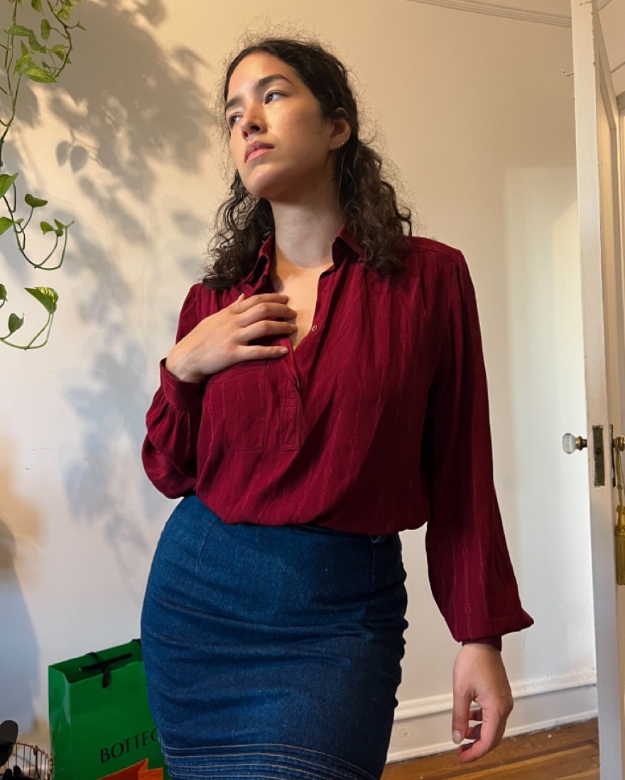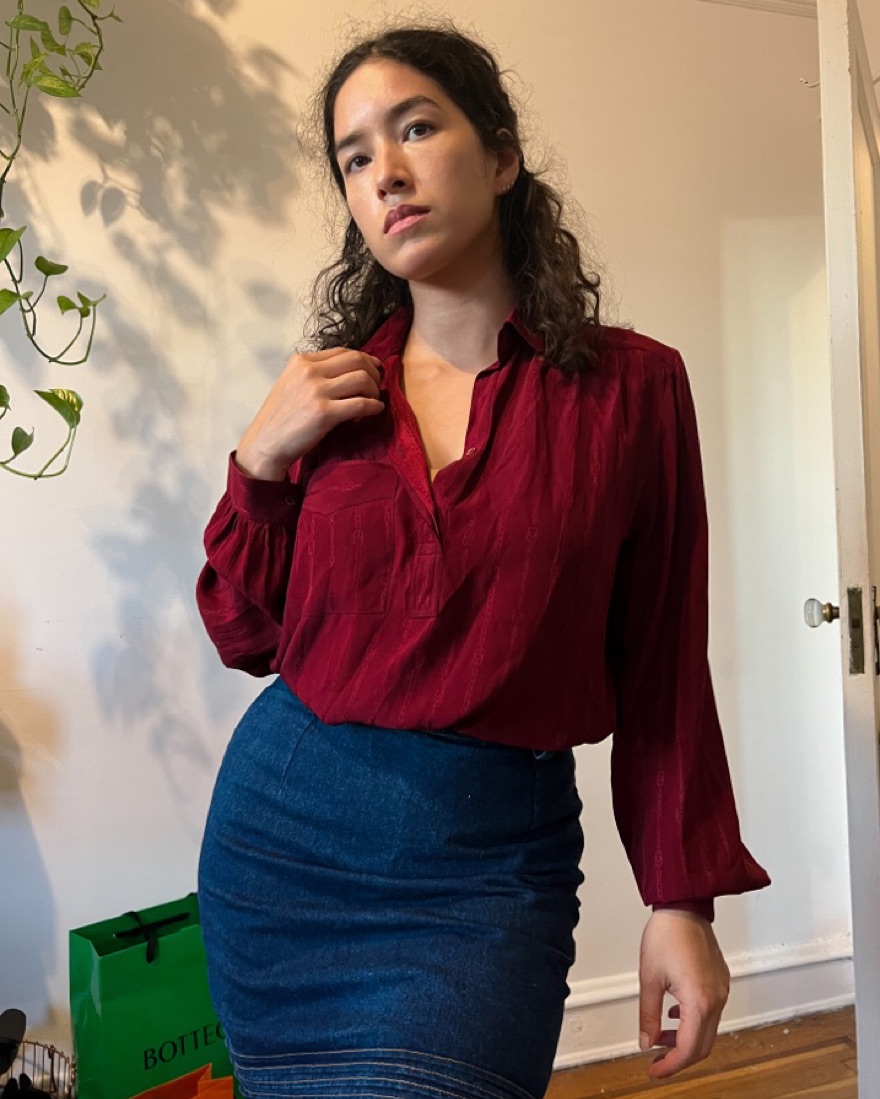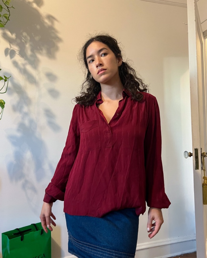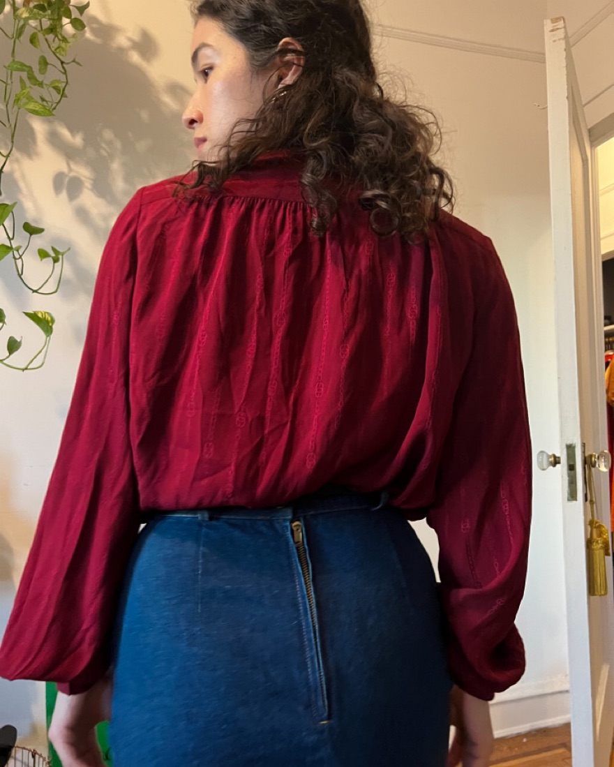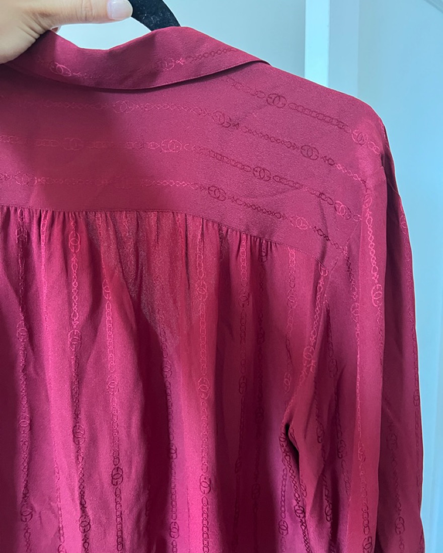 Bought in Italy from a studio that works with deadstock fabrics (imperfect/leftover) from luxury brands. This shirt is made of silk Gucci fabric and is a great color for fall (part of the current collection)!Super comfortable and a bit long on me. Best fits a 6-8