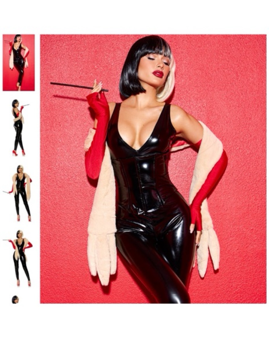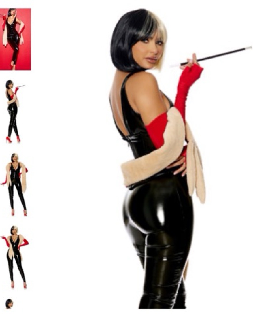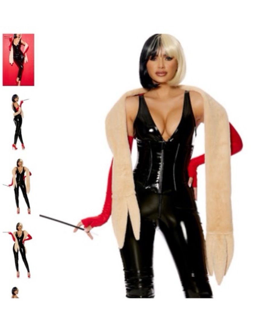 Includes black leather fit, red gloves, furry wrap, wig, and fake cigarette (basically everything in the pic). Fits size XS/S. Don’t wash and please take good care of the wig!