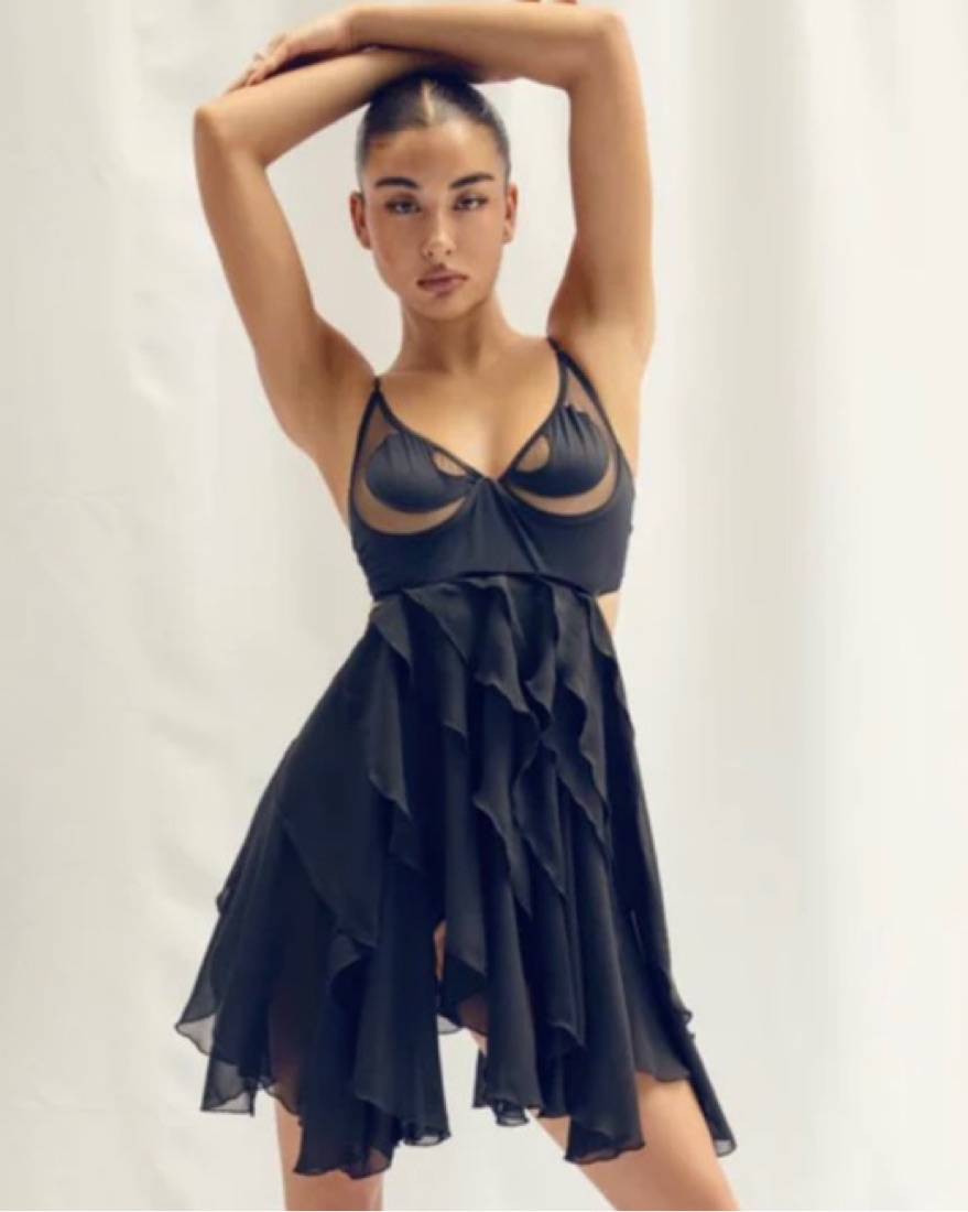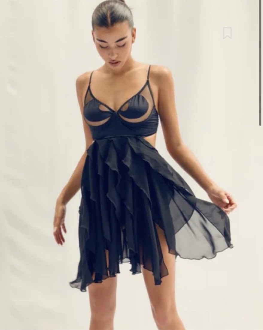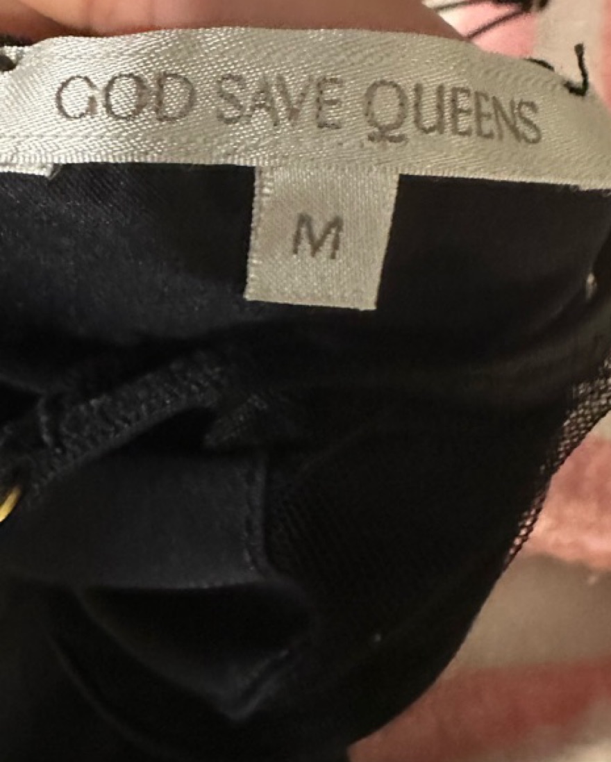 This dress is a statement piece. Seductive sillhouette, open back, and attention grabbing details all throughout. Keep in mind material is a bit see through in the skirt area. But it conceals all the tidy bits! It’s a size medium and runs true to size.