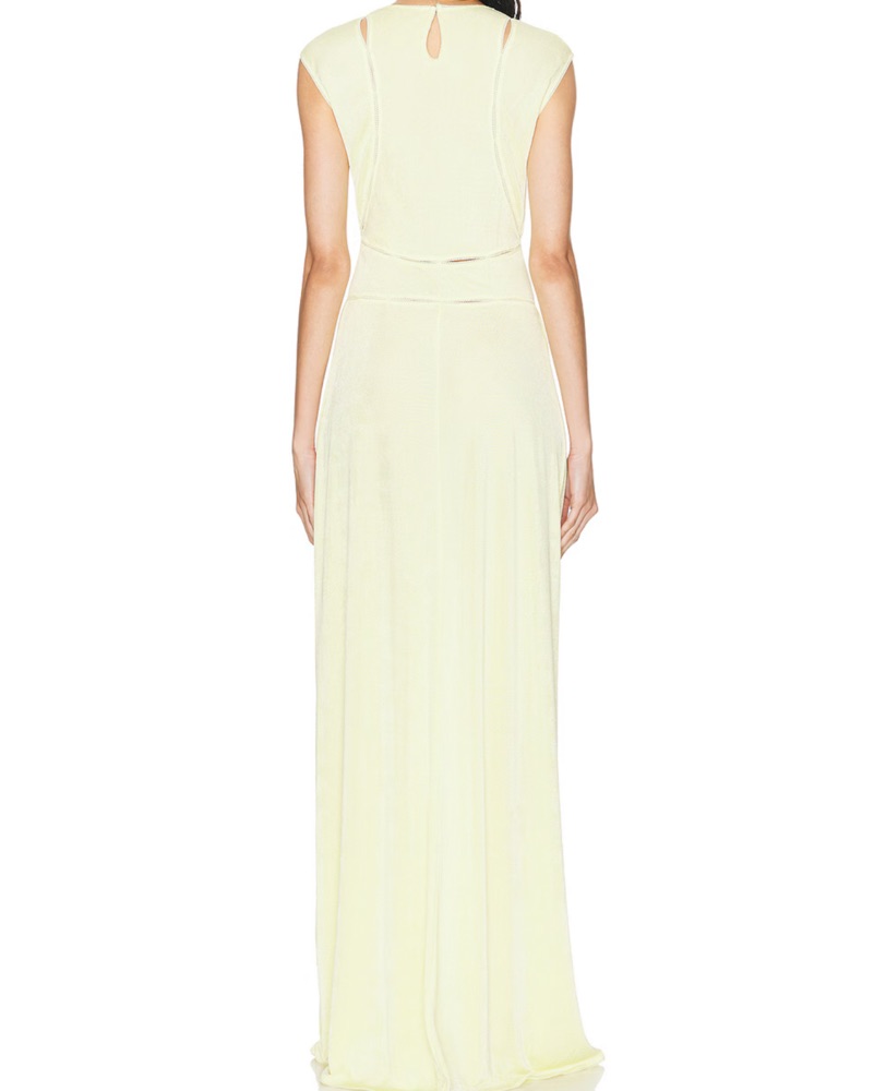Anna October Quinn Maxi Dress in yellow in high-shine jersey fabric. Subtle cut-outs with lace trim. Unlined I wore nude skims underneath, either shorts or a one piece. I can send mine upon request. Very comfortable and elegant for a special occasion.